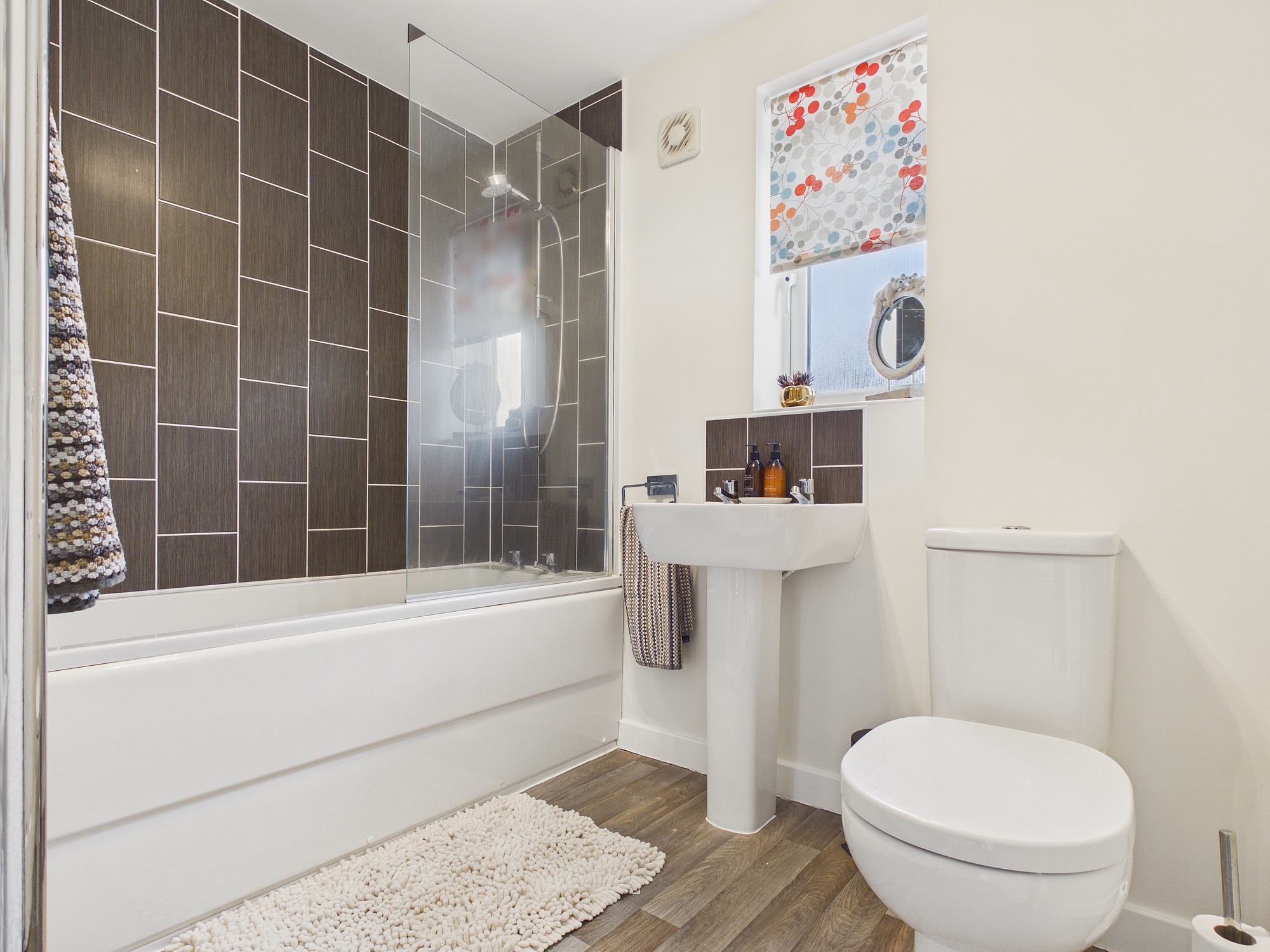 uPVC double glazed window to side, wall mounted heated towel rail, panelled bath with wall mounted shower and glass shower screen, w.c., pedestal handwash basin, lino style flooring, extractor.
