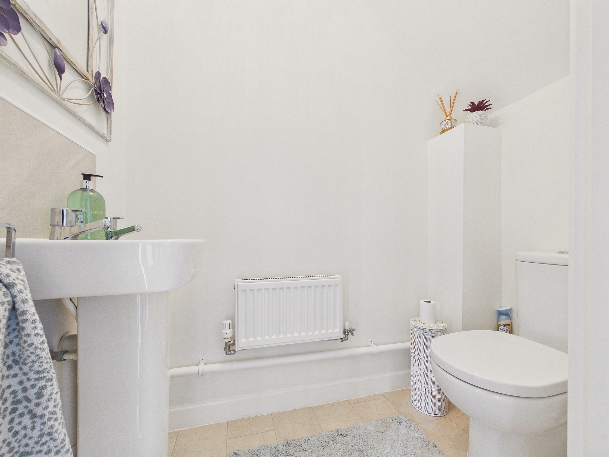Wall mounted single panel radiator, w.c., pedestal handwash basin, lino style flooring, extractor.