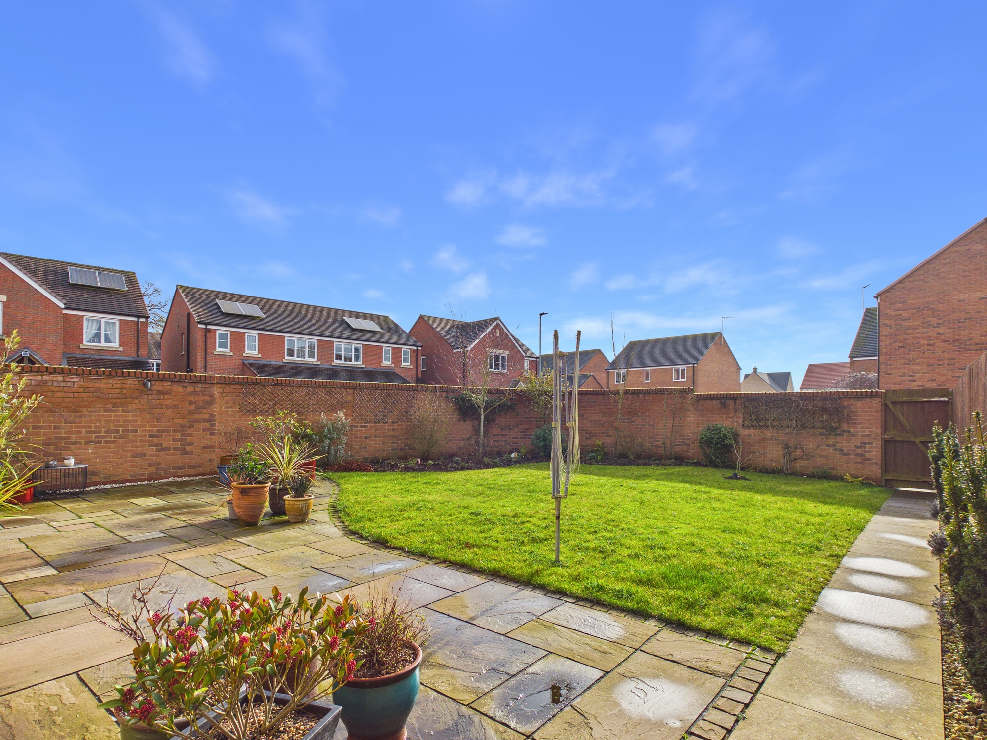 An immaculately presented five bedroom detached property with private driveway and garage, located within this modern development. The accommodation includes the entrance hall with stairs to the first floor and serves the ground floor. The lounge is positioned to the front with electric Opti Myst fire inset. The kitchen/family room has integral appliances and also a separate utility room. There is also a dining room and ground floor cloakroom. The first floor landing leads to the five well proportioned bedrooms, one of which has an en-suite. The bathroom completes the layout. The property has gas central heating and solar panels. Externally there is a south facing walled garden which is mainly laid to lawn with bushes and shrubs inset to borders with a patio.