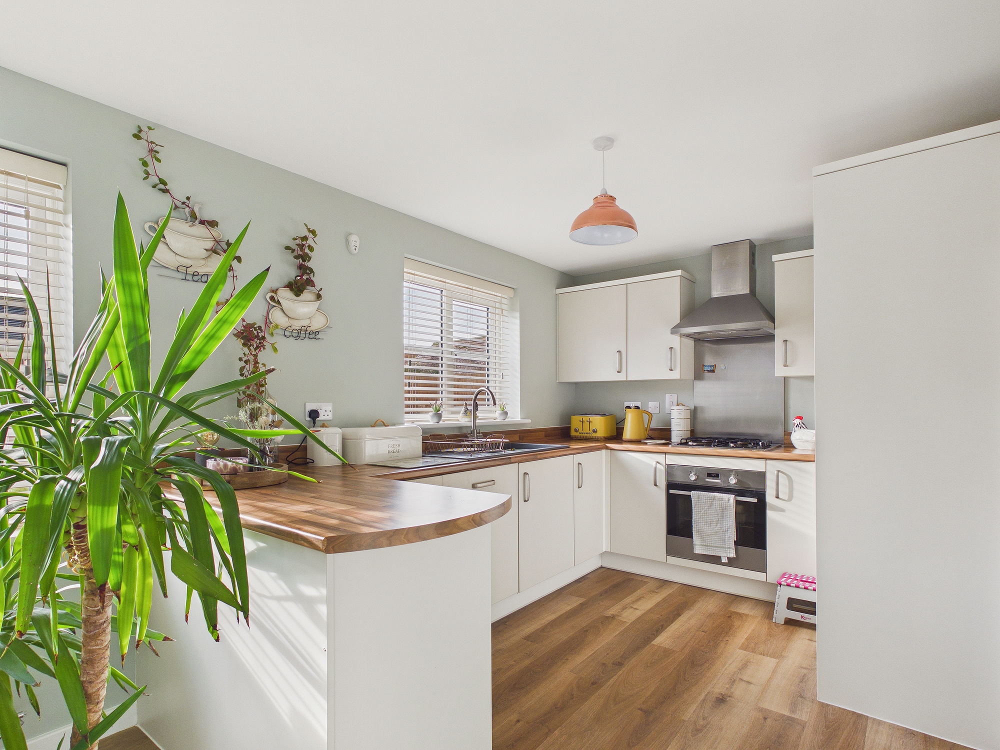 Wall mounted single panel radiator, part glazed door to side, wall mounted gas central heating boiler, base units under round edge worksurfaces with stainless steel sink drainer, spaces for washing machine and tumble drier, LVT flooring, extractor.