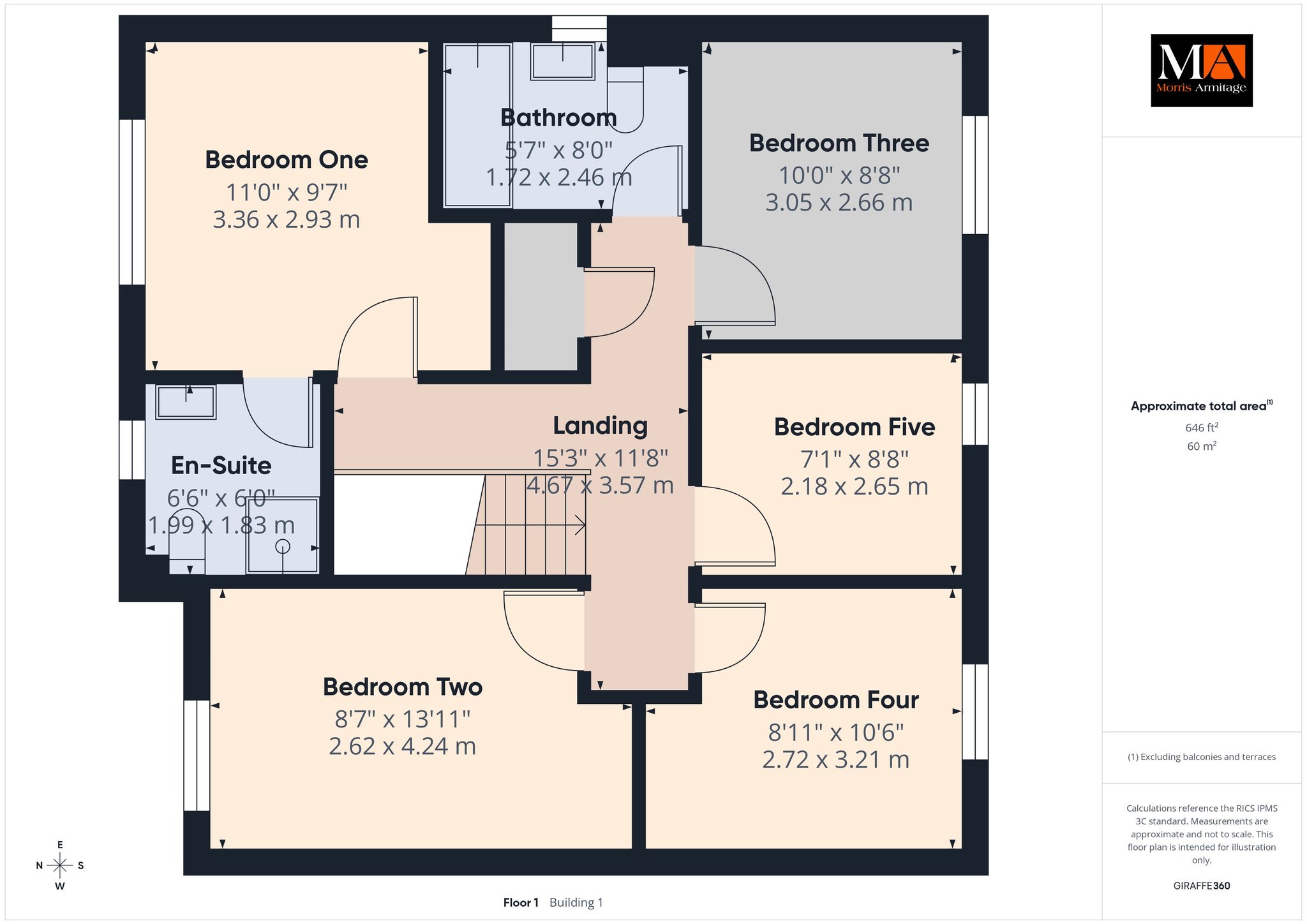 Bedroom One 11’0” x 9’7” (3.36m x 2.93m)