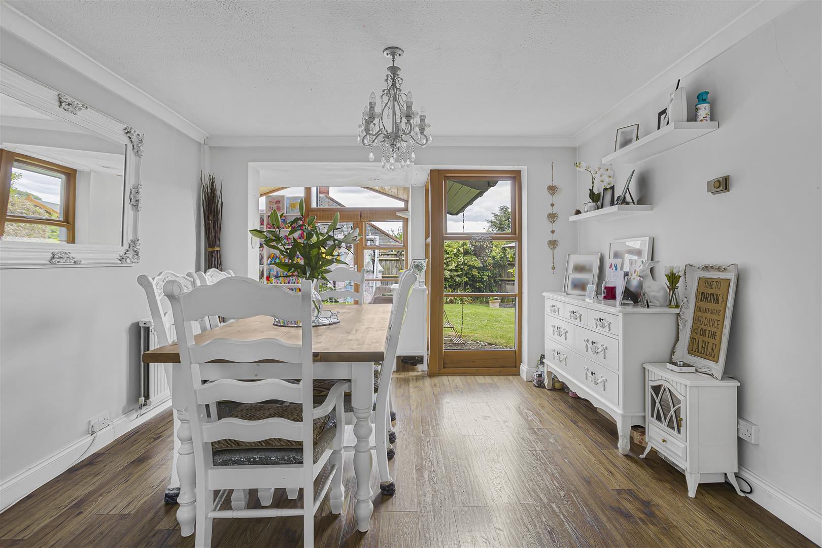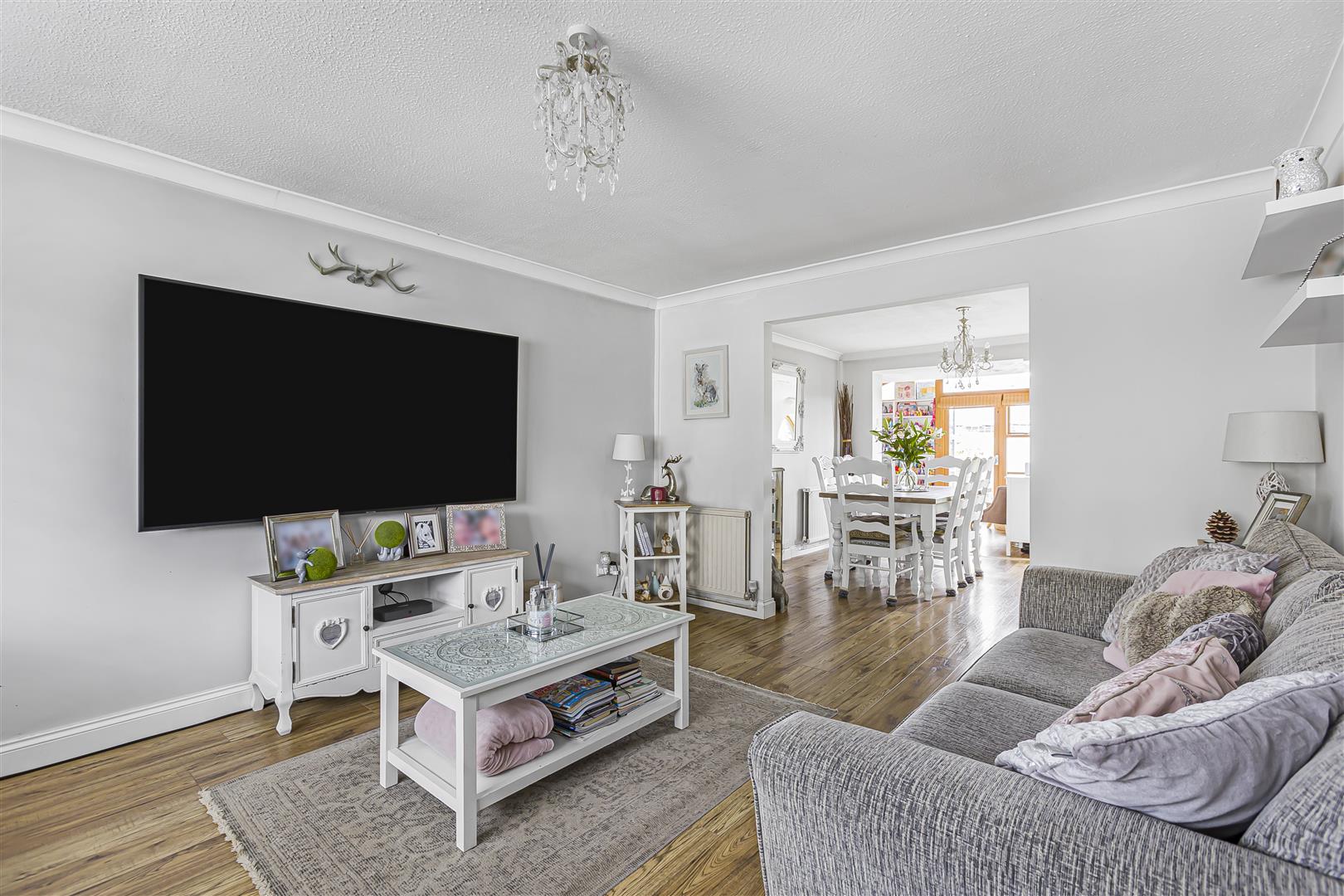 Spacious sitting room with laid wooden flooring, TV connection point, radiator, window to the front aspect and opening through to the:
