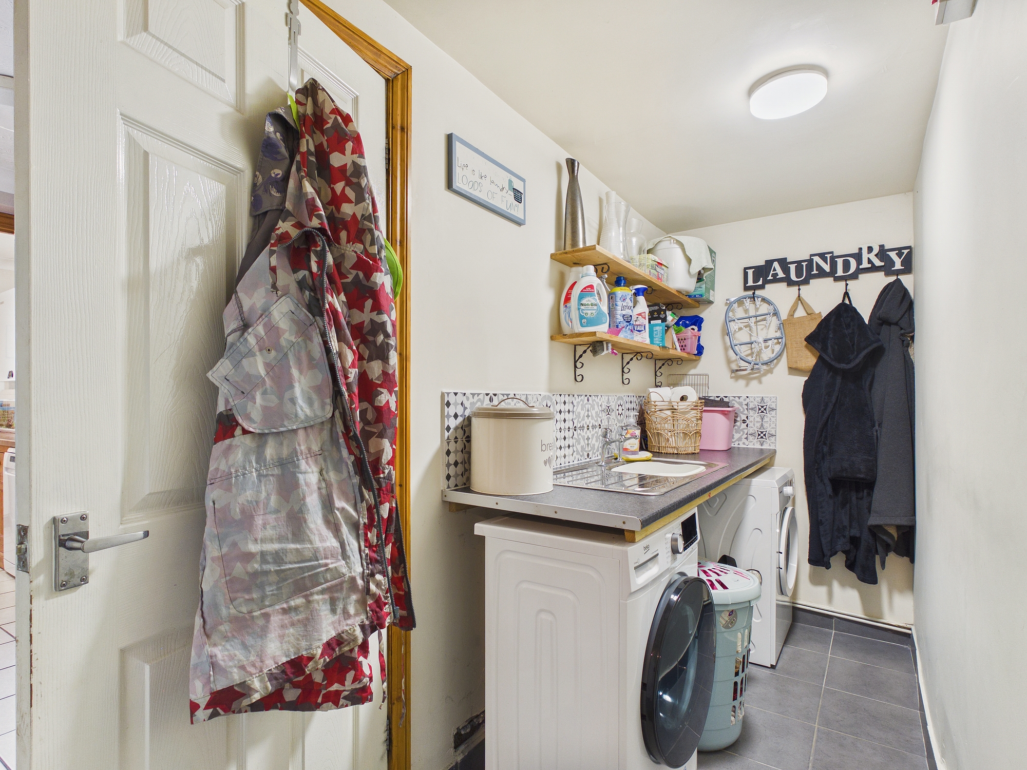 Tiled flooring, uPVC double glazed door to rear garden, door to converted garages.