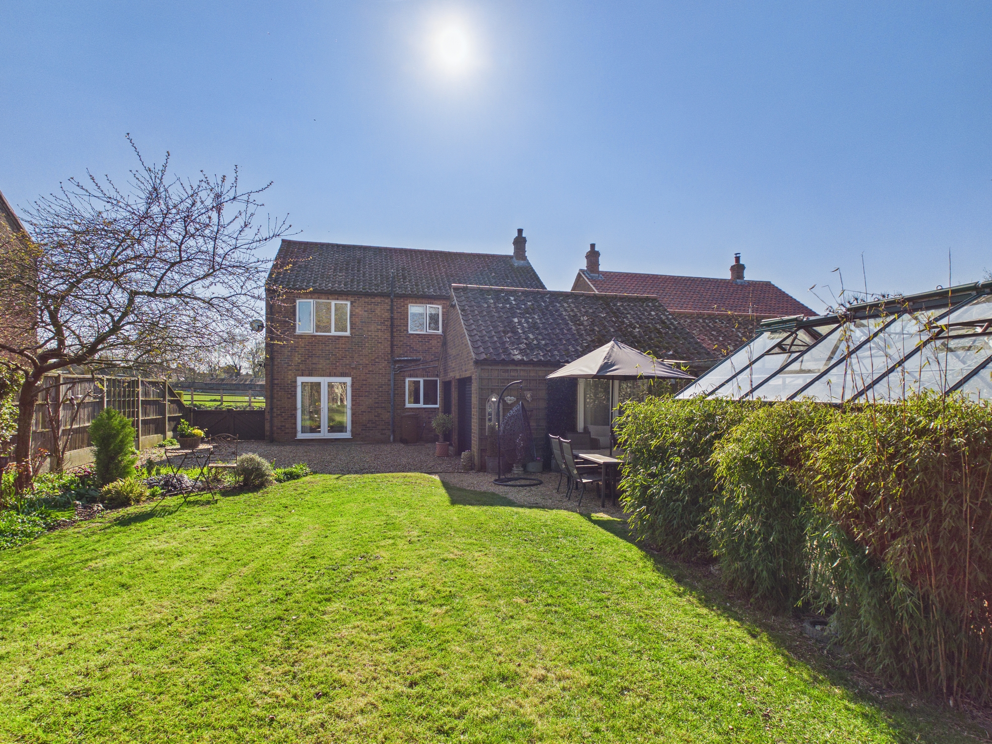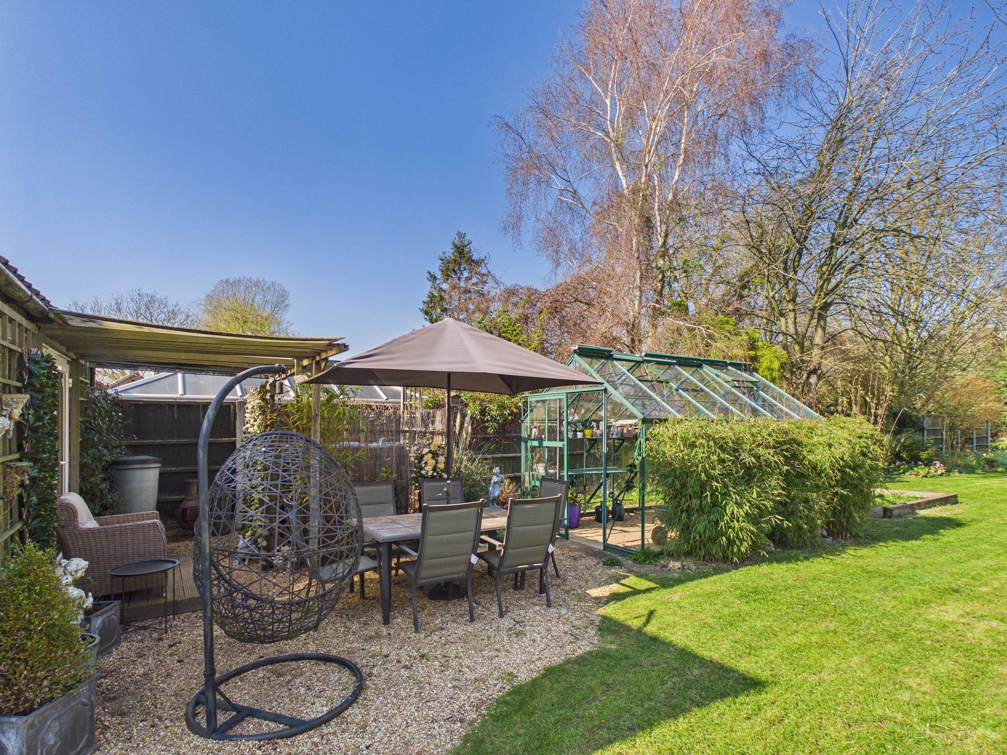 The front of the property is laid to lawn with mature bushes to borders. The shingle driveway leads through double gates providing off road parking. The spacious rear garden is mainly laid to lawn with mature bushes and trees inset and to borders and continues around behind the neighboring gardens. There is also a pergola and greenhouse inset.
