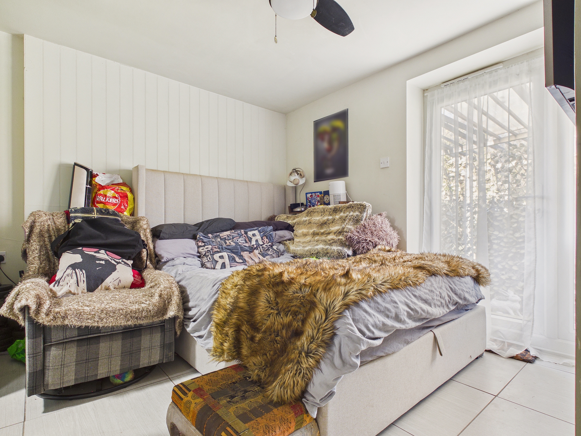 uPVC double glazed door to rear garden, built in wardrobes/storage, wall mounted double panel radiator, tiled flooring, ceiling fan, sliding door to:-