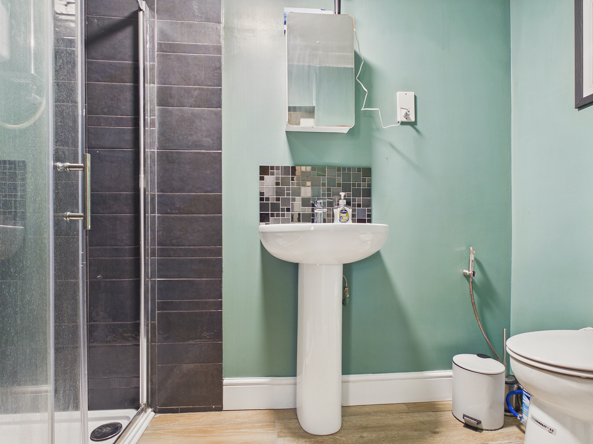 Wall mounted heated towel rail, walk in double shower with sliding door, w.c., pedestal handwash basin, tiled flooring, extractor.