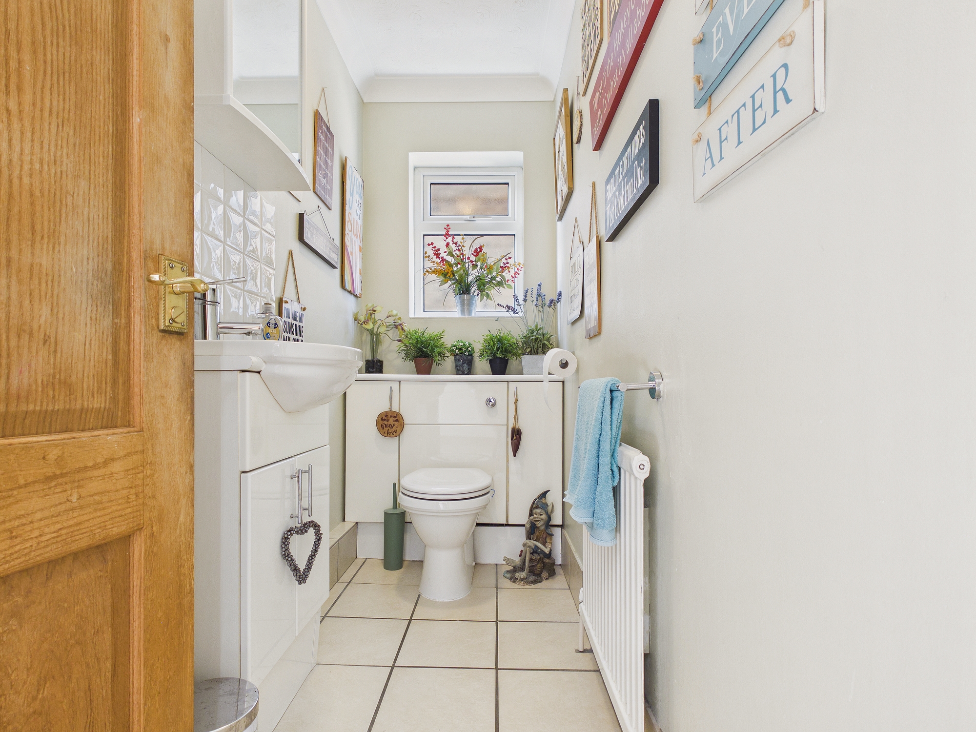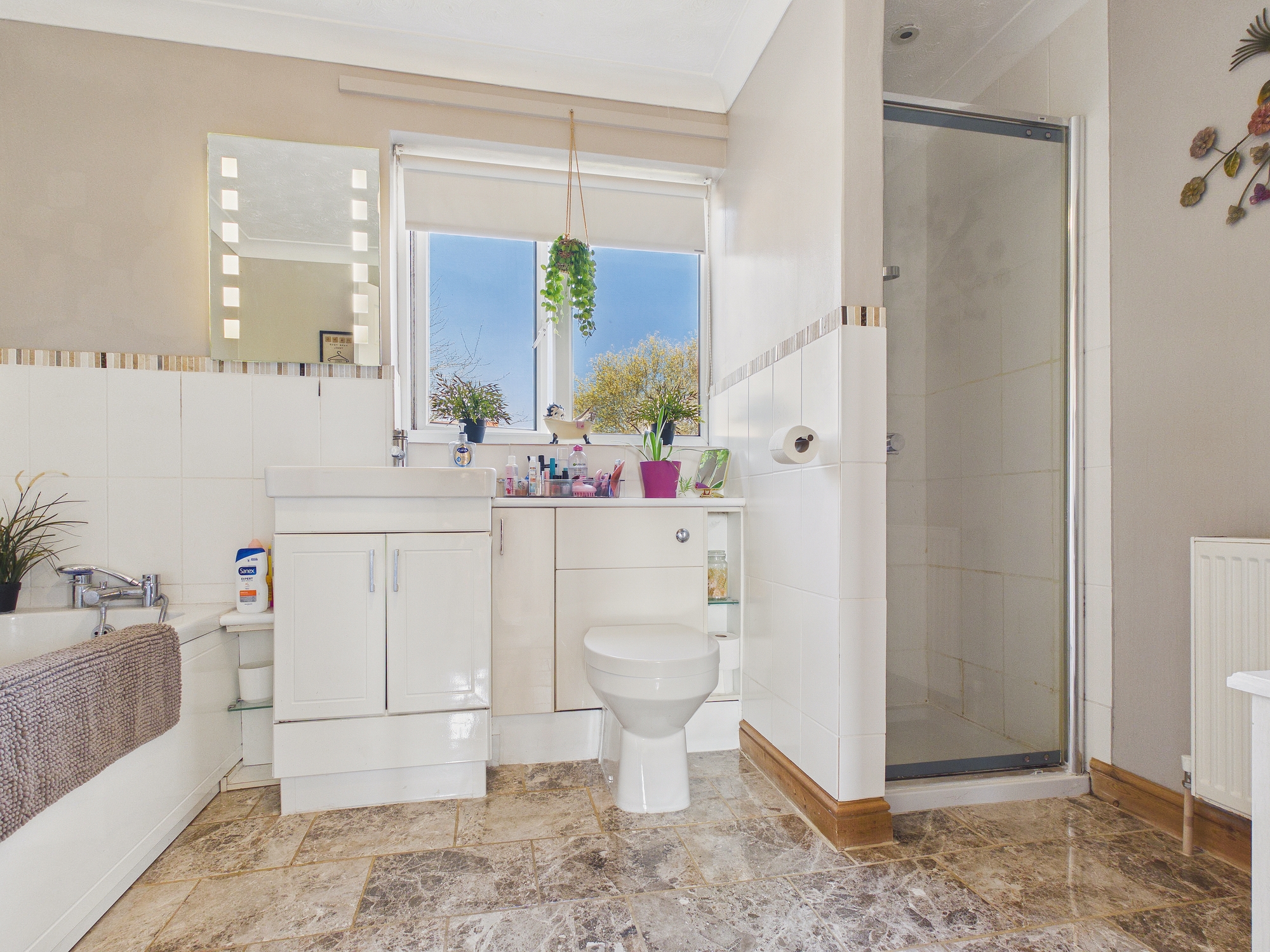 uPVC double glazed window to rear, wall mounted double panel radiator, heated towel rail, panelled bath with mixer tap and shower attachment over, shower cubicle with glass door, concealed cistern w.c. and handwash basin inset to vanity unit, tiled flooring, textured and coved ceiling, partly tiled walls.