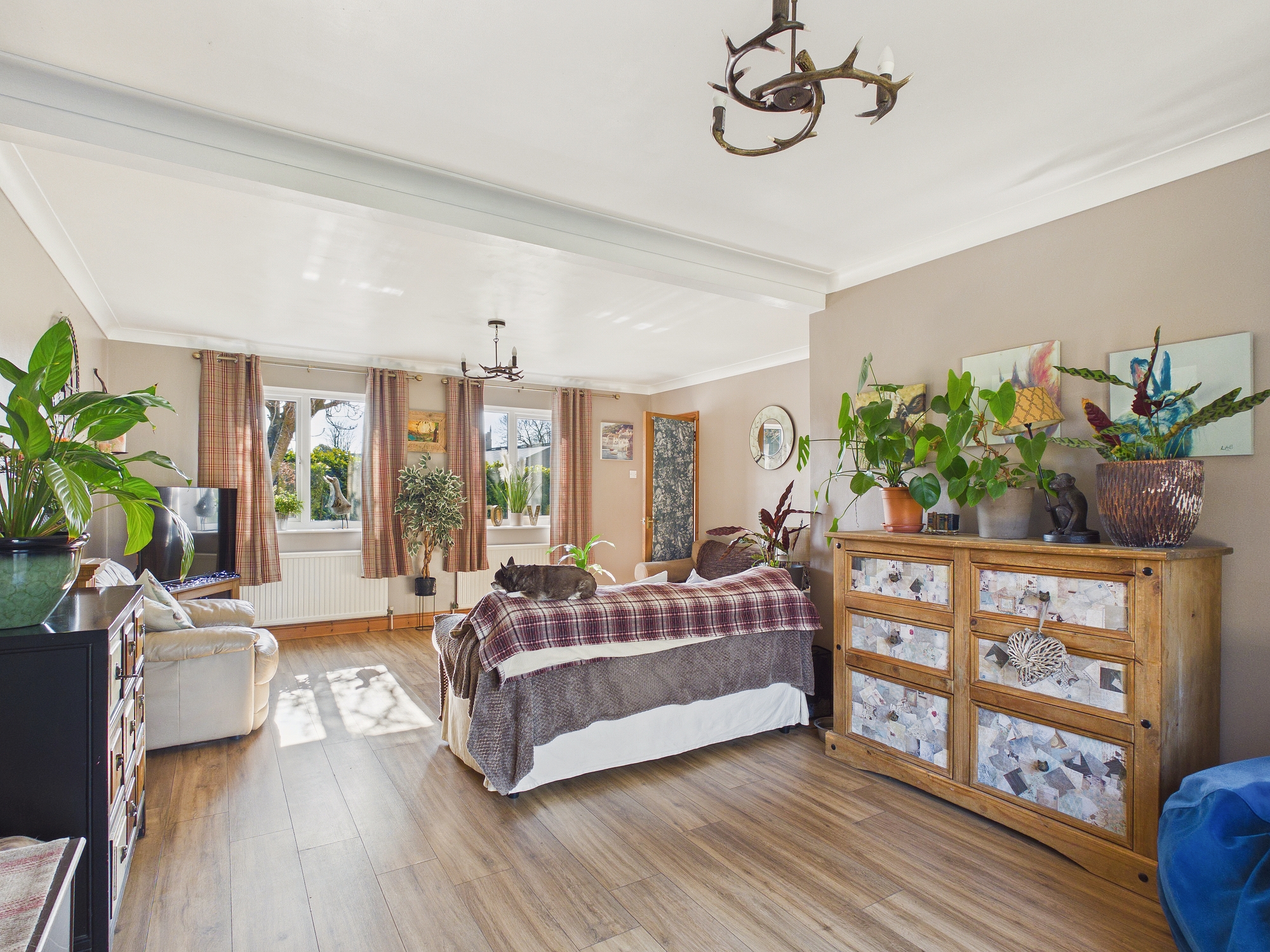 uPVC double glazed window to rear, wall mounted single panel radiator, laminate style flooring, coved ceiling with central ceiling fan.