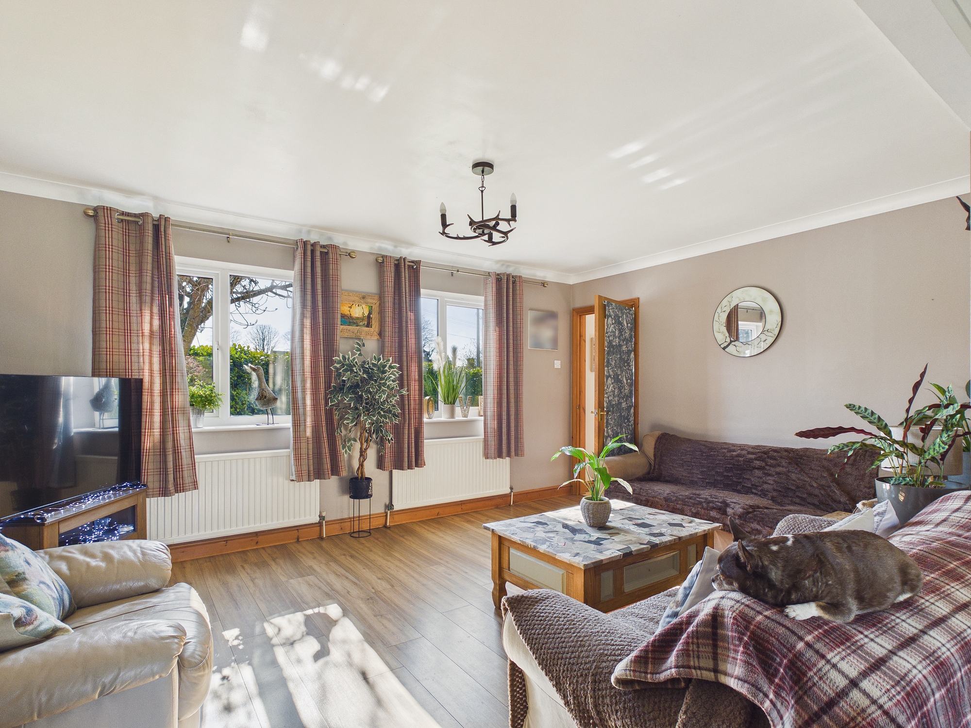 2 x uPVC double glazed window to front, uPVC double glazed French doors to rear, 2 x wall mounted single panel radiator, wall mounted double panel radiator, laminate style flooring, coved ceiling.
