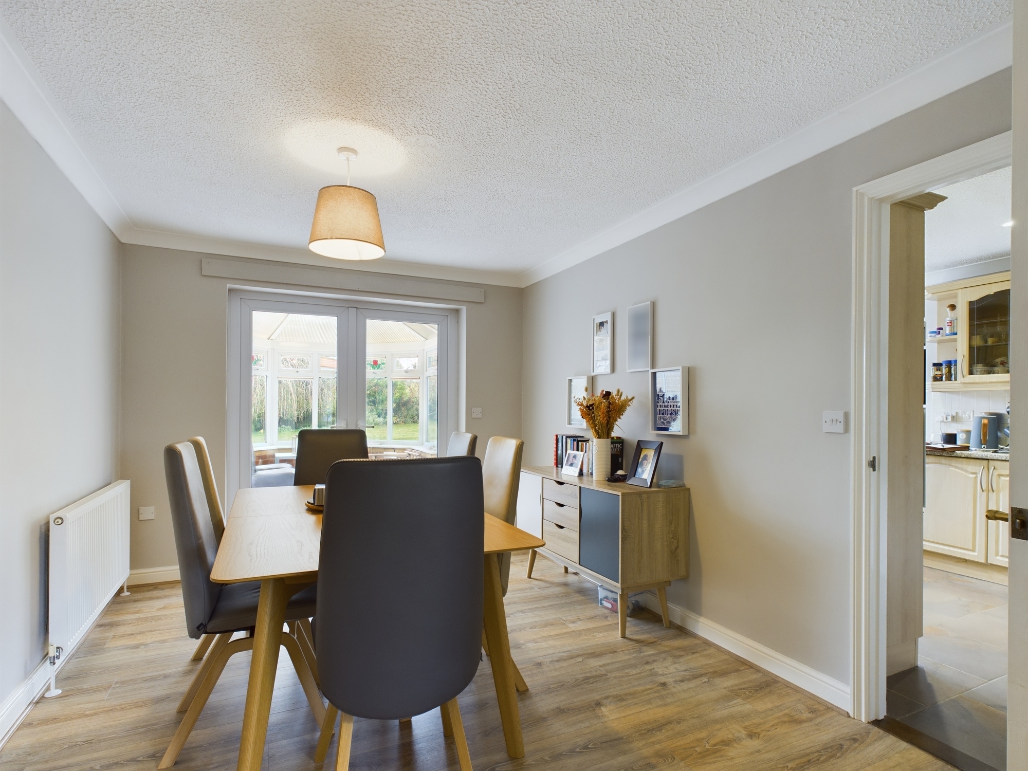 Wall mounted single panel radiator, laminate style flooring, textured and coved ceiling, door through to kitchen, uPVC double glazed doors to:-
