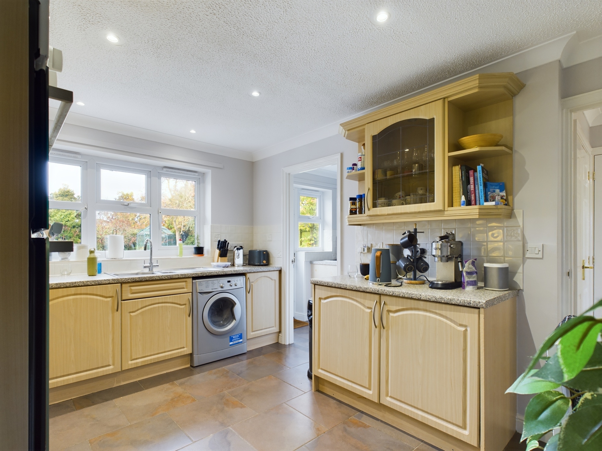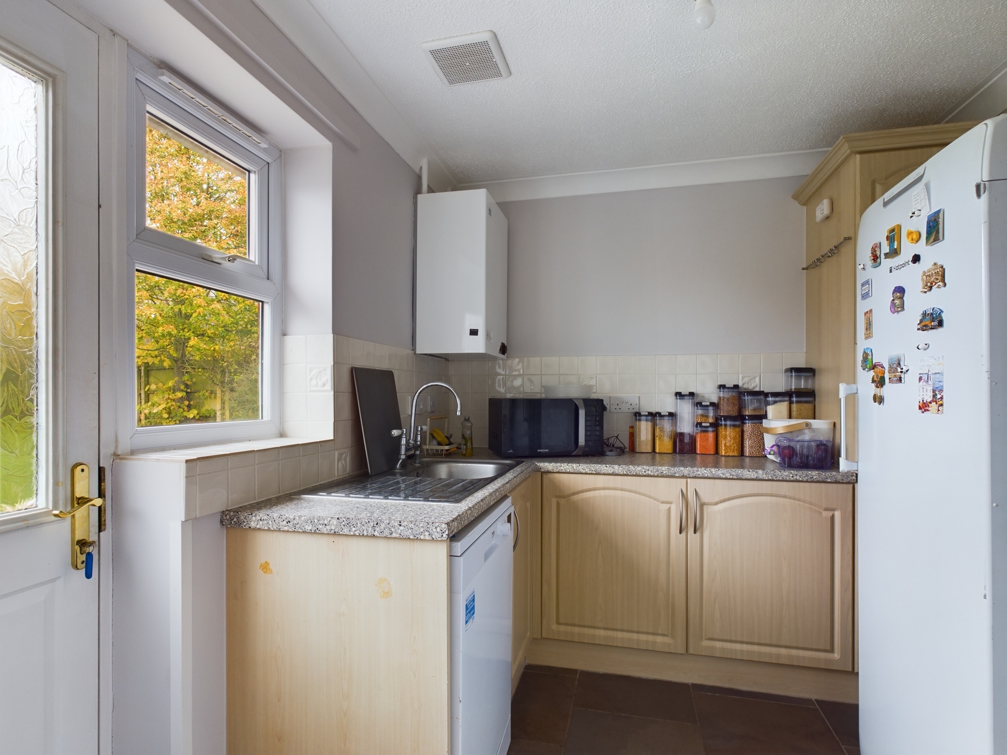 uPVC double glazed window to rear, part glazed door to rear, base units under round edge worksurfaces with stainless steel sink drainer inset with mixer tap over, wall mounted single panel radiator, tiled flooring, space for washing machine, textured and coved ceiling, wall mounted oil central heating boiler.