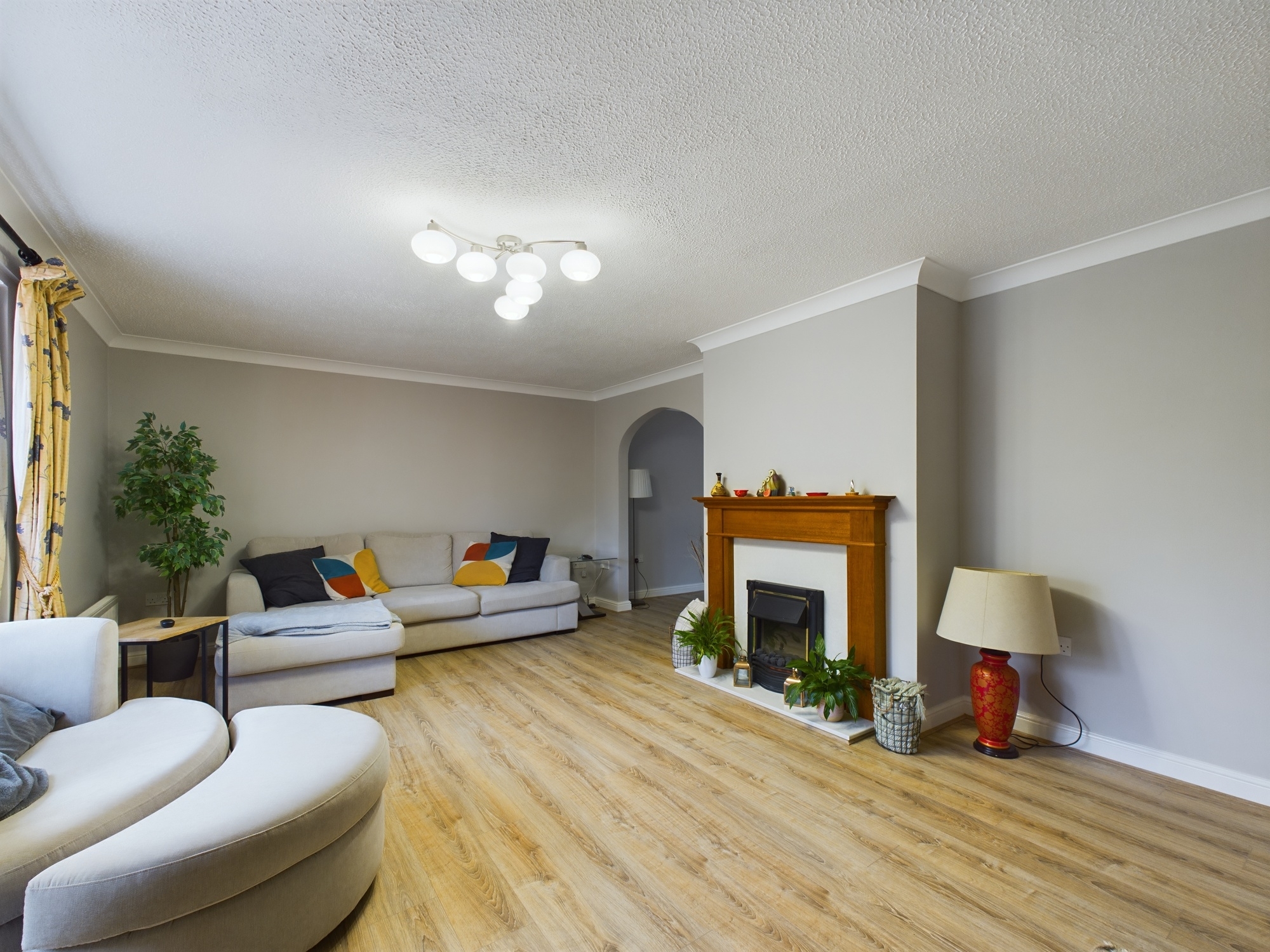 uPVC double glazed bay window to front, 2 x wall mounted single panel radiators, laminate style flooring, textured and coved ceiling, central fireplace with electric fire inset, arch opening through to:-
