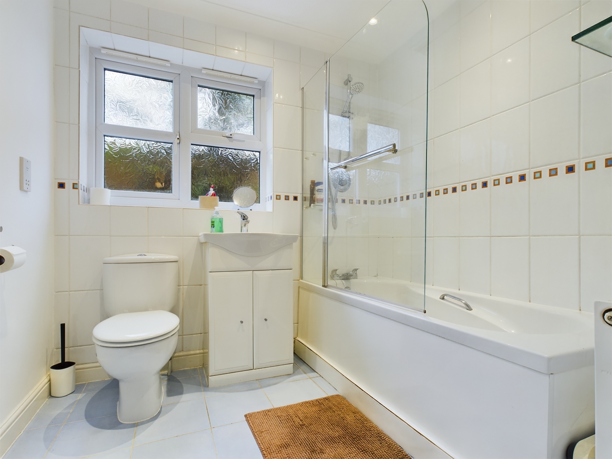 uPVC double glazed window to side, wall mounted single panel radiator, panelled bath with wall mounted shower and glass shower screen, w.c., handwash basin inset to vanity unit, tiled flooring, partly tiled wall, shaver socket, textured and coved ceiling.