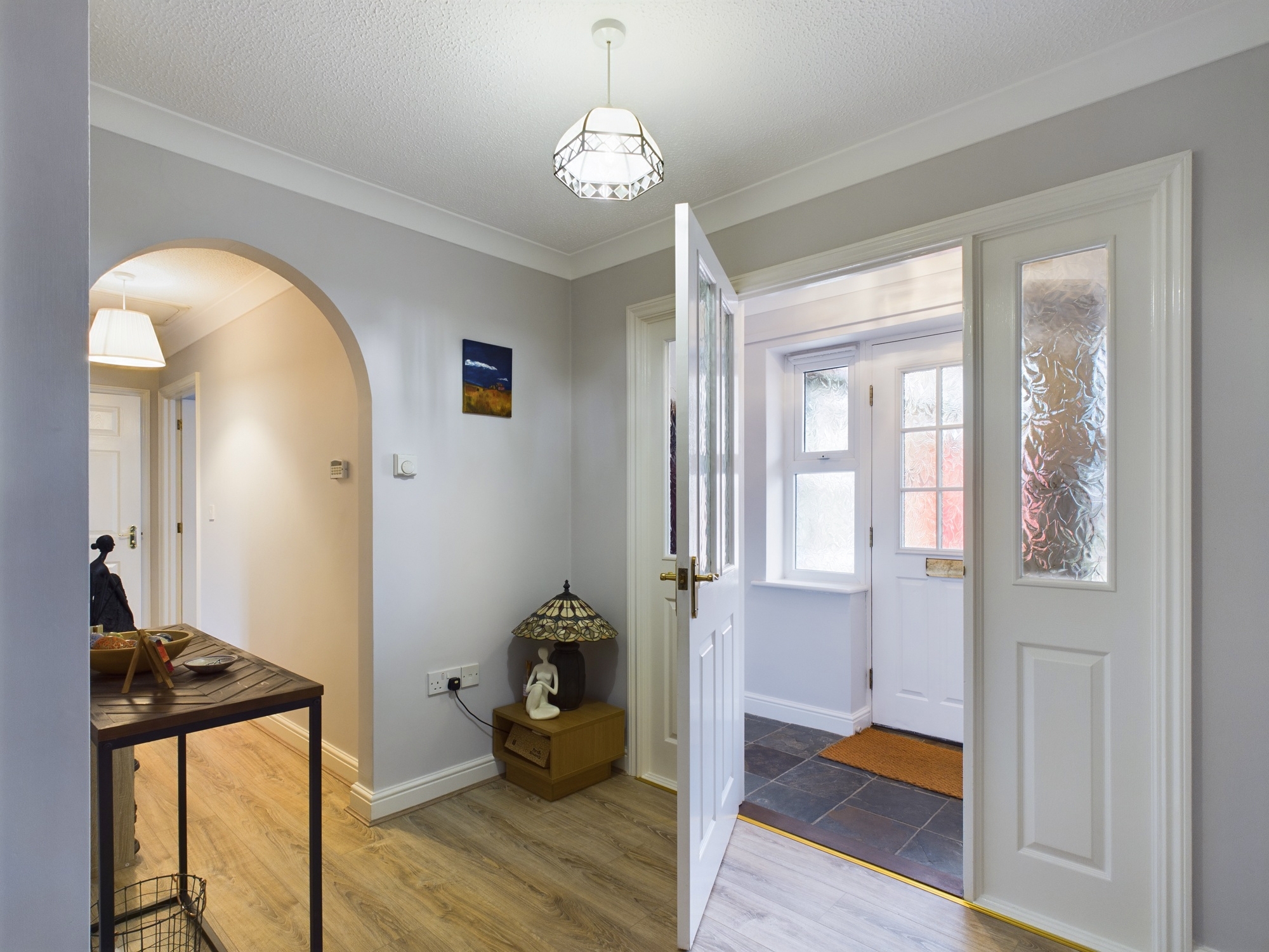 uPVC double glazed windows to front, wall mounted single panel radiator, tiled flooring, wall mounted coat pegs, textured and coved ceiling, part glazed door to:-