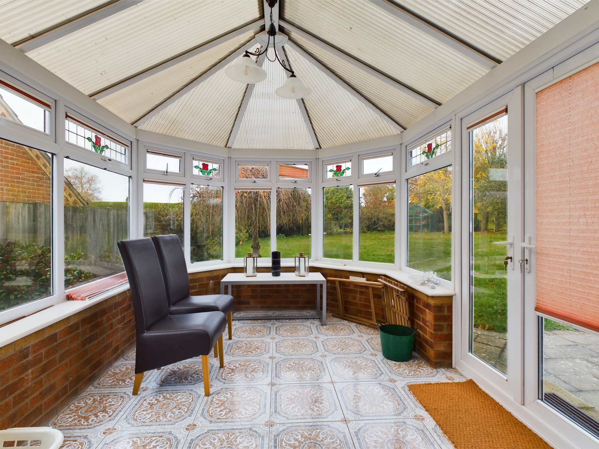 Part brick and uPVC double glazed construction with built in blinds and vaulted polycarbonate roofing, tiled flooring, uPVC double glazed doors to rear garden.