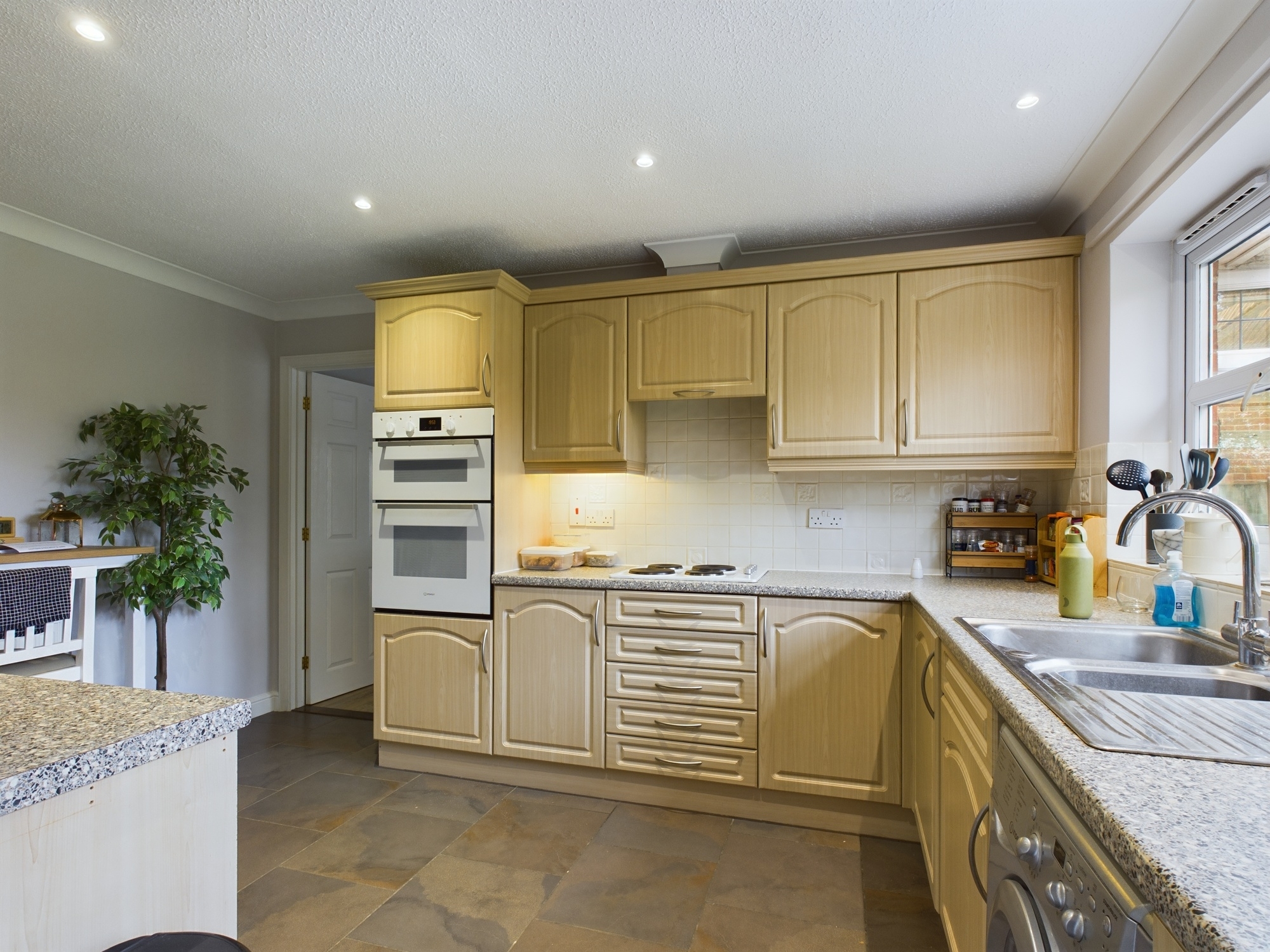 uPVC double glazed window to rear, wall mounted single panel radiator, wall and base units under round edge work surfaces, 1 1/2 stainless steel sink drainer with mixer tap over, 4 ring electric hob inset to worksurface with extractor over, eye level double oven, space for dishwasher, integral fridge and freezer under counter, tiled flooring, door to hallway, door to:-