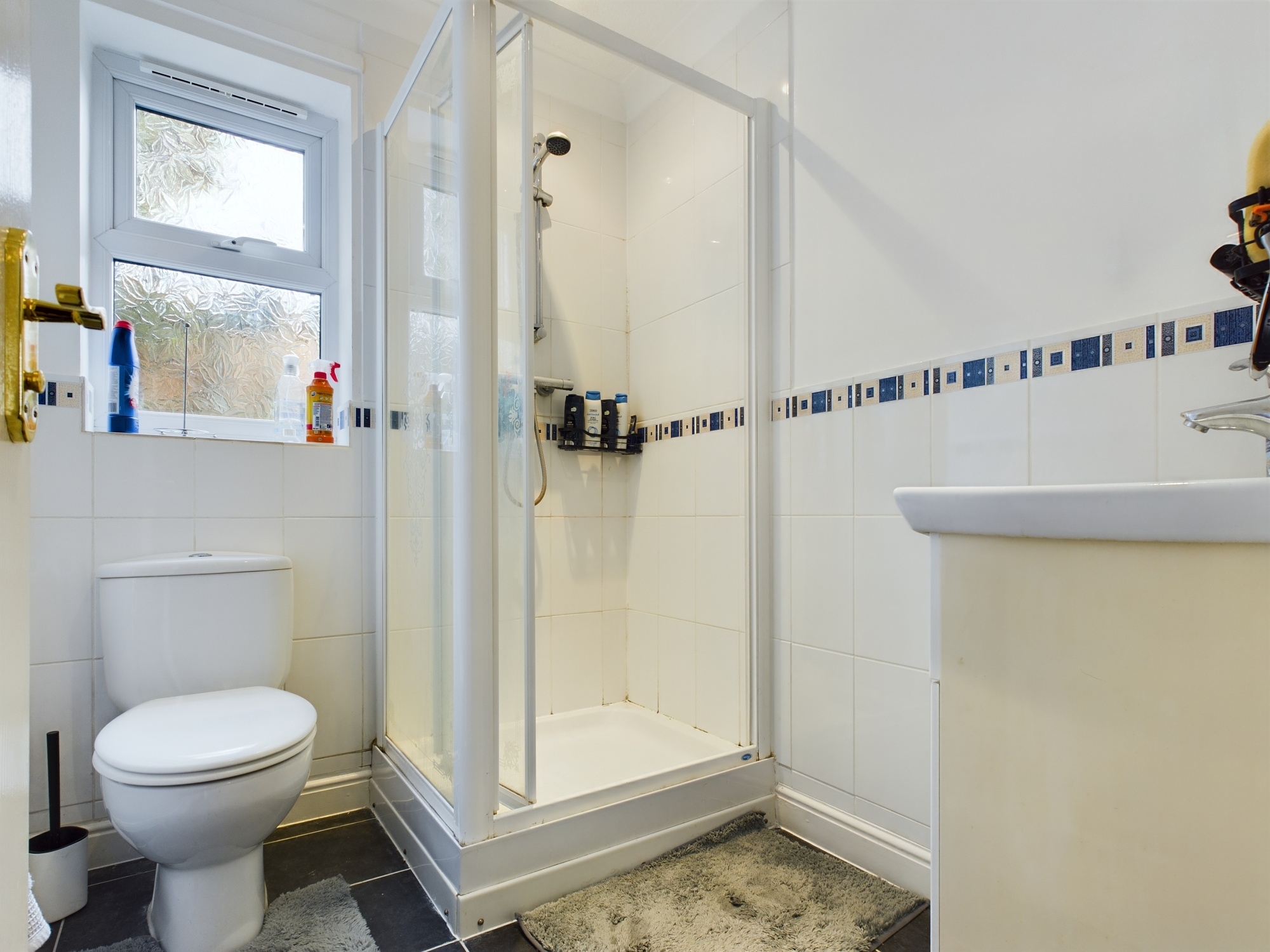 uPVC double glazed window to side, wall mounted single panel radiator, corner shower cubicle, w.c., handwash basin inset to vanity unit, tiled flooring, partly tiled walls, textured and coved ceiling.