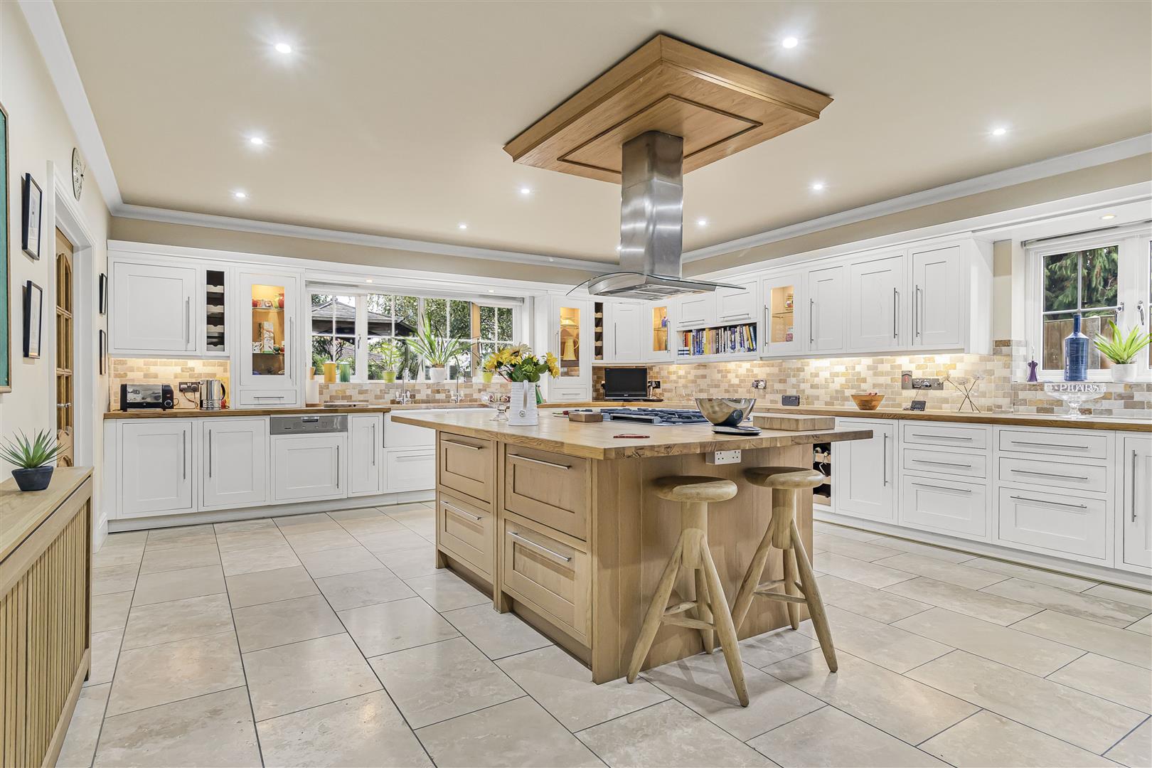 Contemporary fitted kitchen with a wide range of matching storage units with wooden working surfaces over. Tiled splashbacks. Two ceramic sinks each fitted with stainless steel mixer tap over. Integrated dishwasher and fridge freezer. Kitchen island housing large range cooker with extractor hood above, Fitted display cabinet. Tiled flooring, Dual aspect windows to the rear and side aspects, Door through to the: