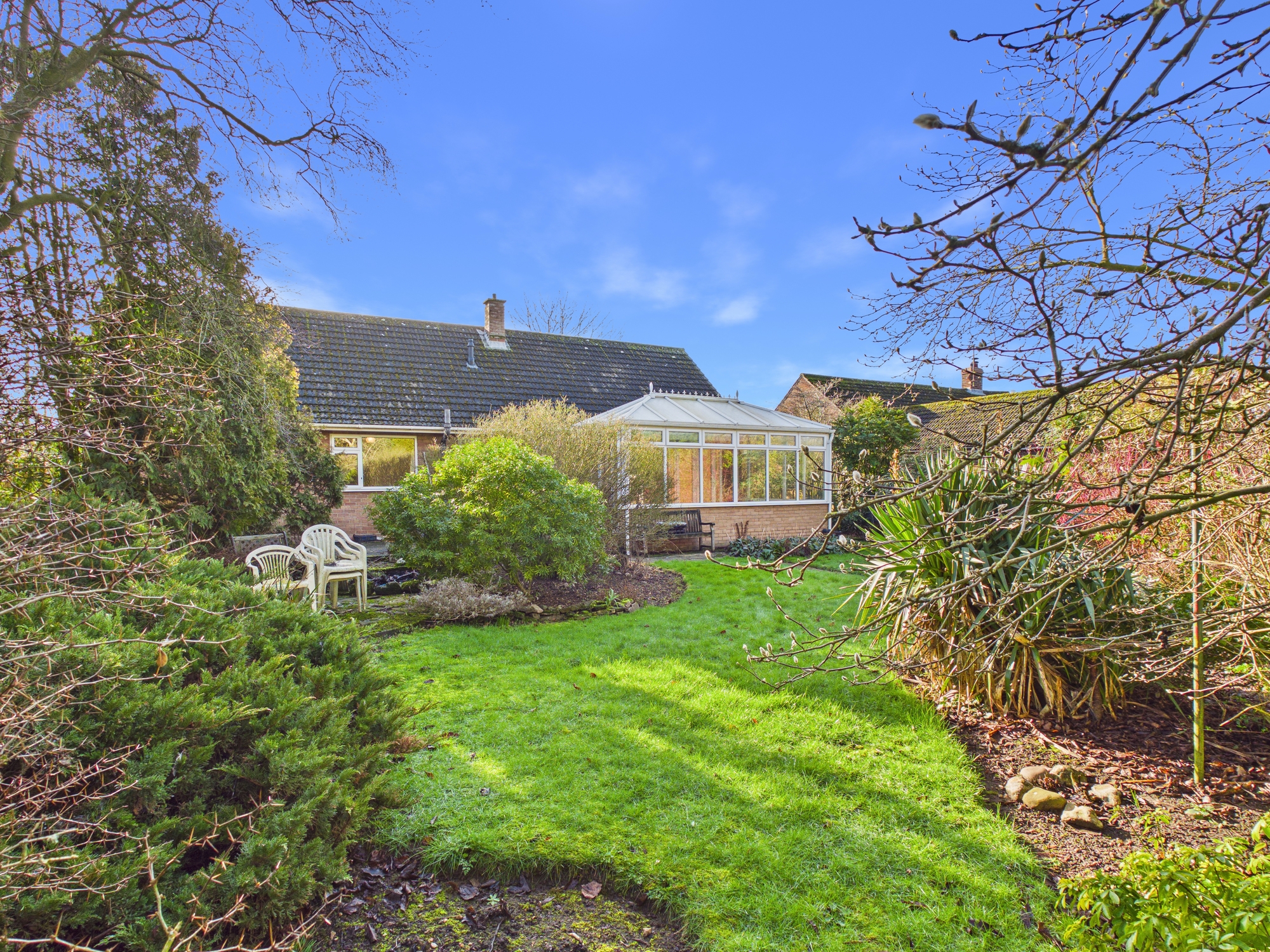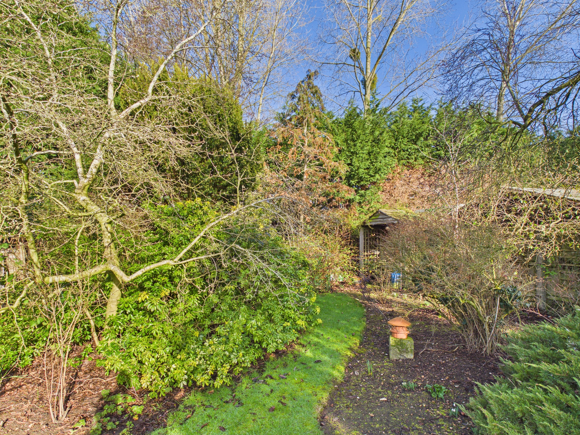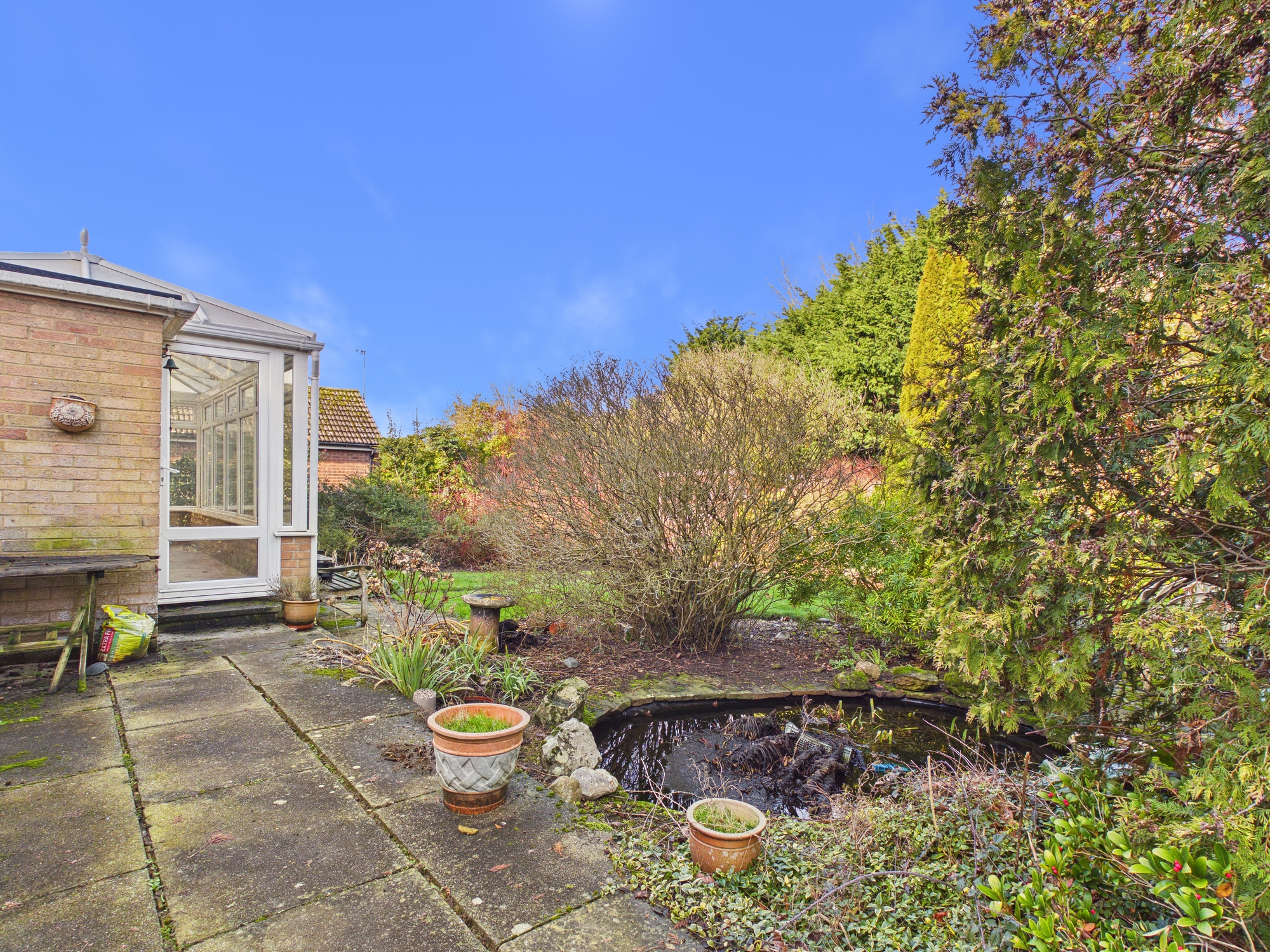 Brick pillars lead through to the front garden which is laid to lawn with a range of mature bushes and shrubs inset. The shingle driveway provides off road parking and leads to the garage. There are pathways to both sides leading to the mature rear garden which is laid to lawn with bushes and shrubs inset and to borders with a pond, raised patio area, wooden storage shed and greenhouse inset.