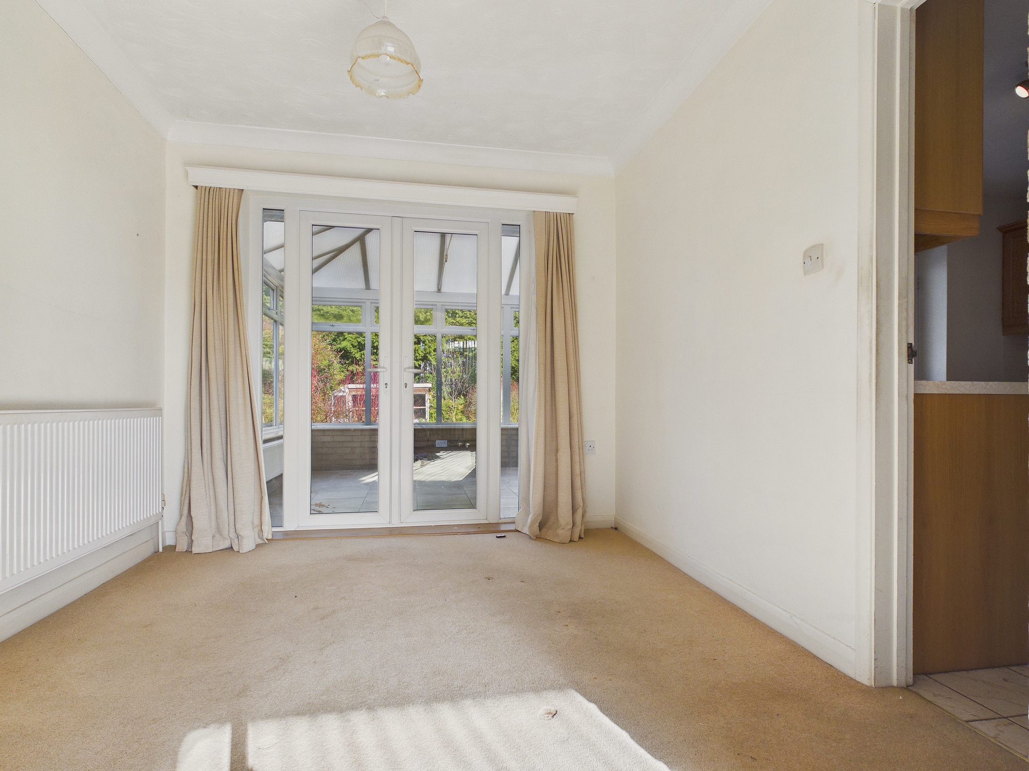 Wall mounted single panel radiator, textured and coved ceiling, uPVC double glazed French doors to conservatory, door to:-