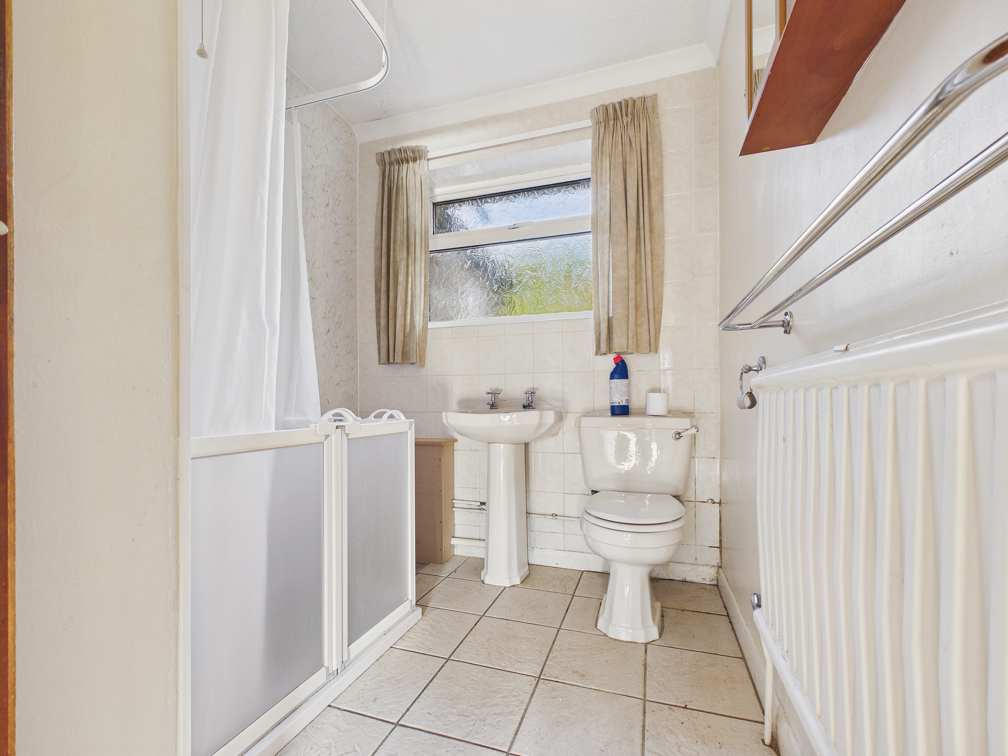 uPVC double glazed window to rear, wall mounted single panel radiator, walk in shower with shower curtain, w.c., pedestal handwash basin, tiled flooring, partly tiled walls, textured and coved ceiling.