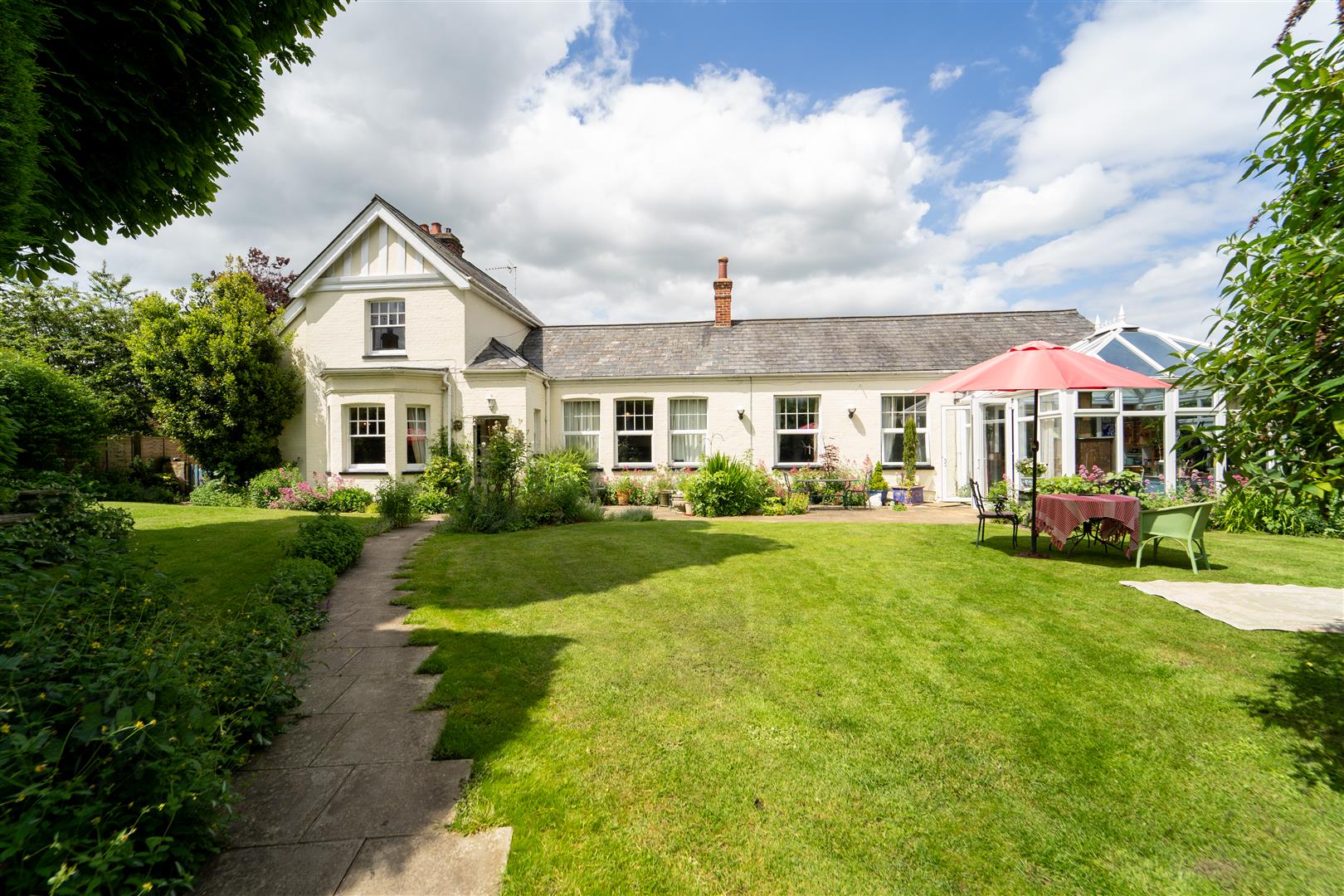 Delightful, private garden with manicured lawn areas, border of mature flowers and shrubs and some mature trees. Patio area outside conservatory. Pathway leading from parking area to house. Outside of the garden, driveway providing substantial parking for several cars. Double gates leading to the garden plus secure side gate for access. Brick built secure outbuilding (17.5ft x 15ft) with a variety of possible uses with window and door to driveway.