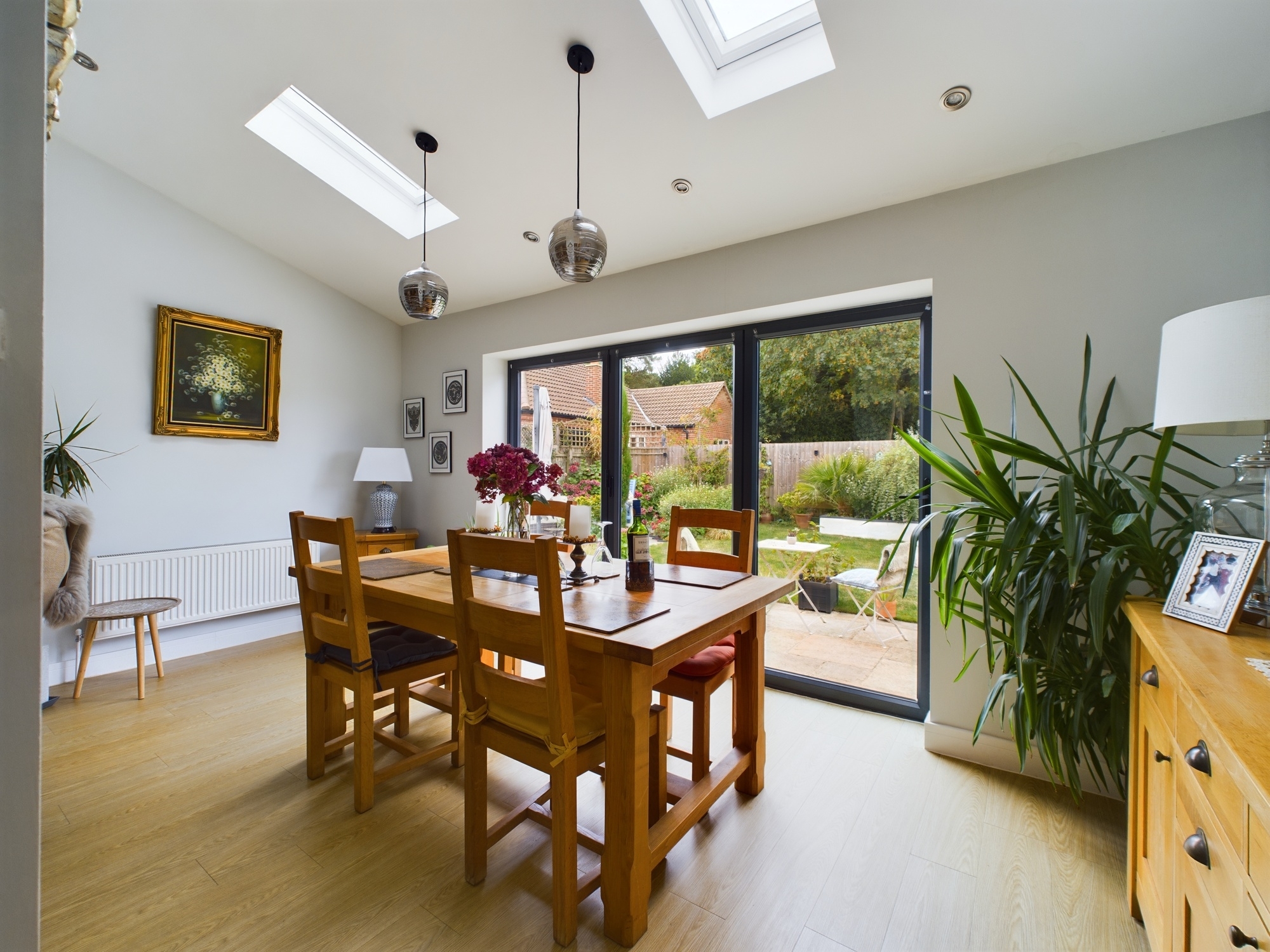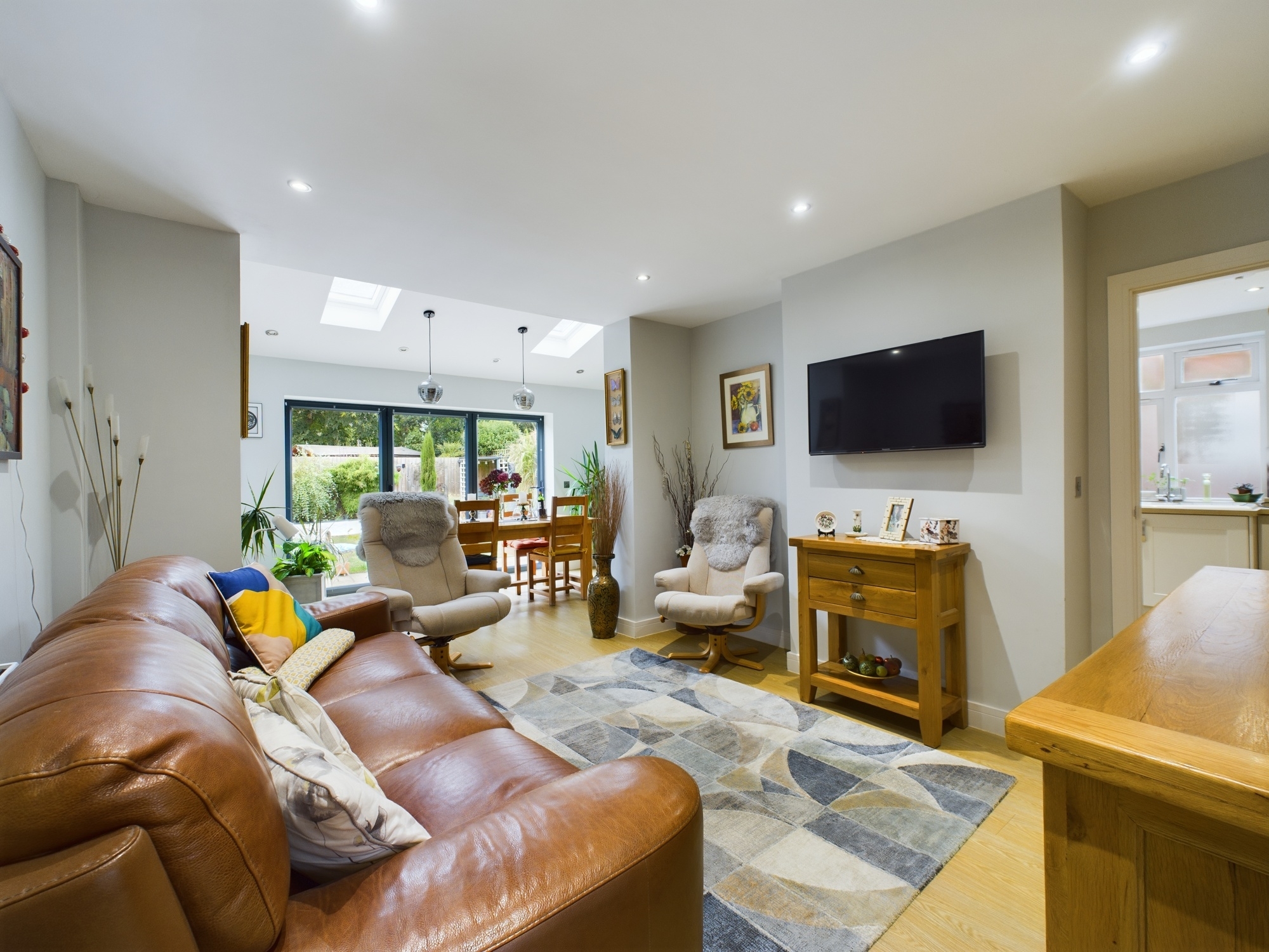 Wall mounted double panel radiator, UPVC tri-fold doors to rear, two Velux style windows to rear, ceiling spot lights opening through to:
