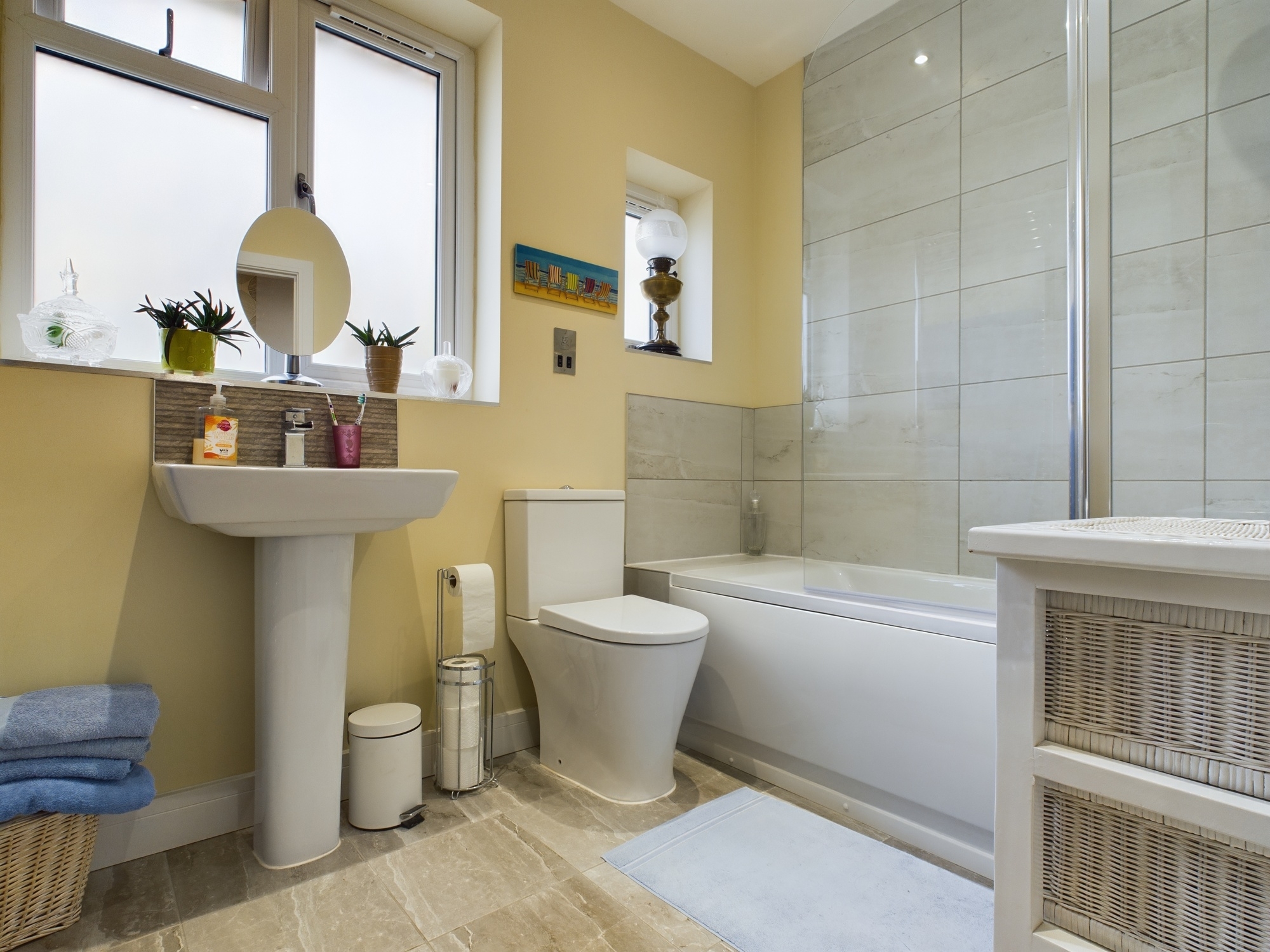UPVC double glazed window to side, wall mounted heated towel rail, paneled bath with wall mounted shower over and glass shower screen, w.c, pedestal hand wash basin, tiled flooring, ceiling spotlights and extractor.