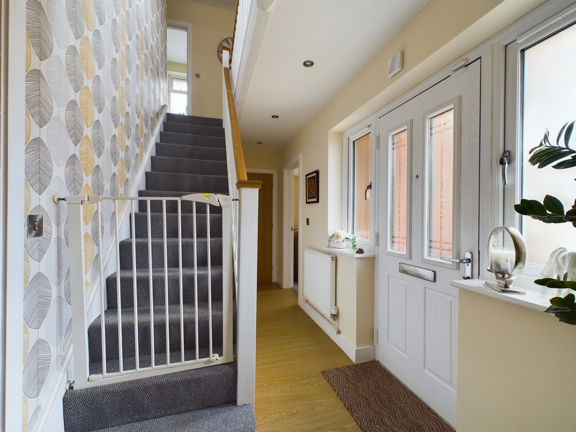 UPVC double glazed windows to front, wall mounted single panel radiator, stairs to first floor with storage cupboard under, ceiling spotlights , integral door to garage and doors to all rooms.