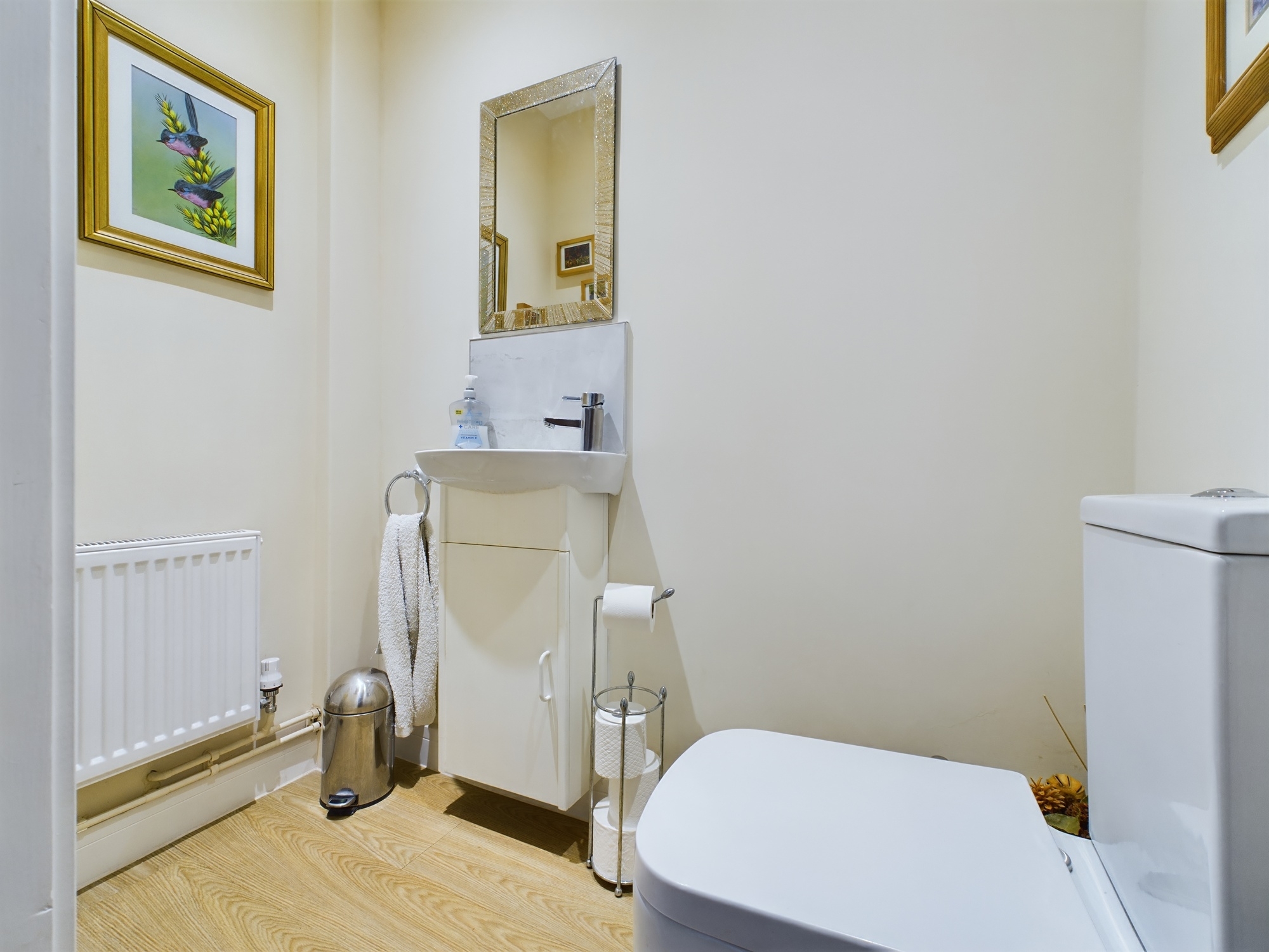 Wall mounted single panel radiator, w.c., hand wash basin inset to vanity unit, ceiling spotlights and extractor.