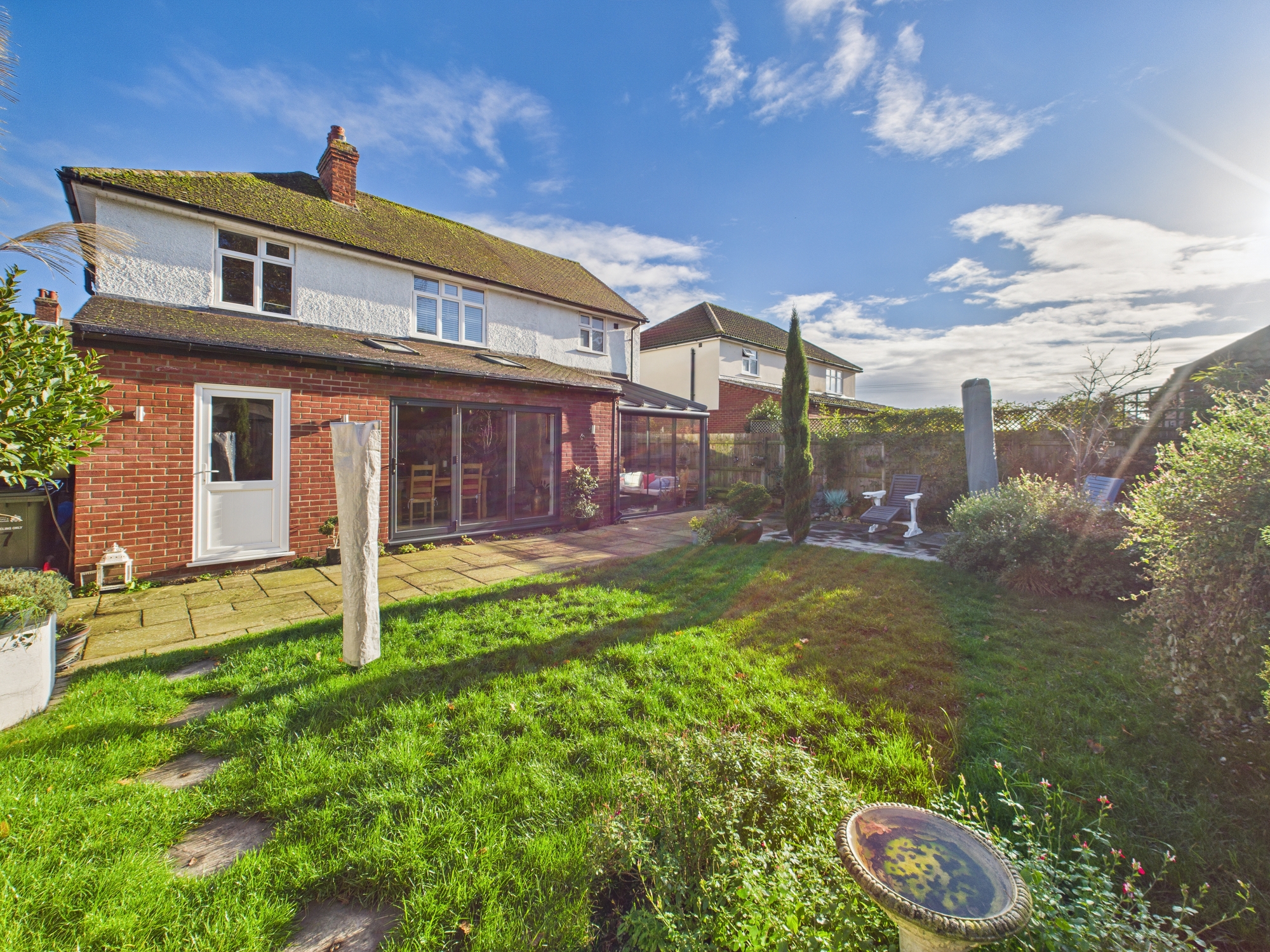 Floor to ceiling double glazed sliding doors with glass roofing and access from the rear garden.