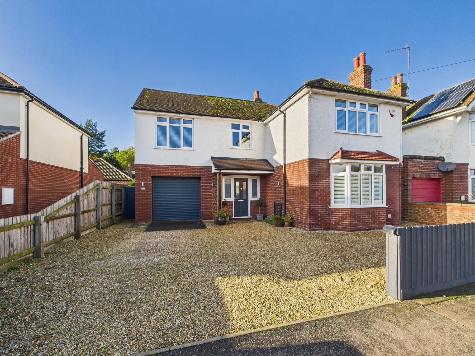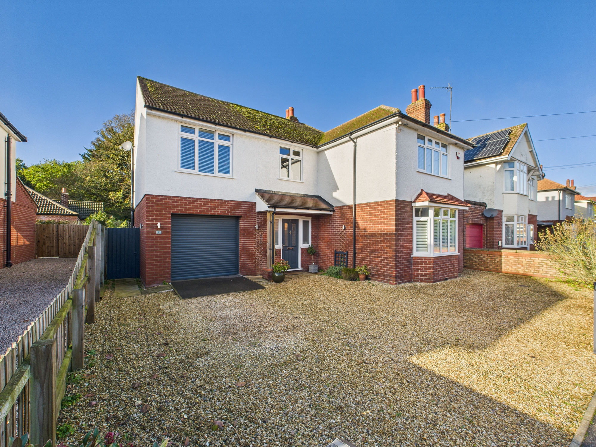 The front of the property is laid to shingle providing off road parking and leads to the garage with electric roller door. The rear garden is mainly laid to lawn with a patio inset with a range of bushes and shrubs to borders in raised beds, enclosed by fencing, access to: