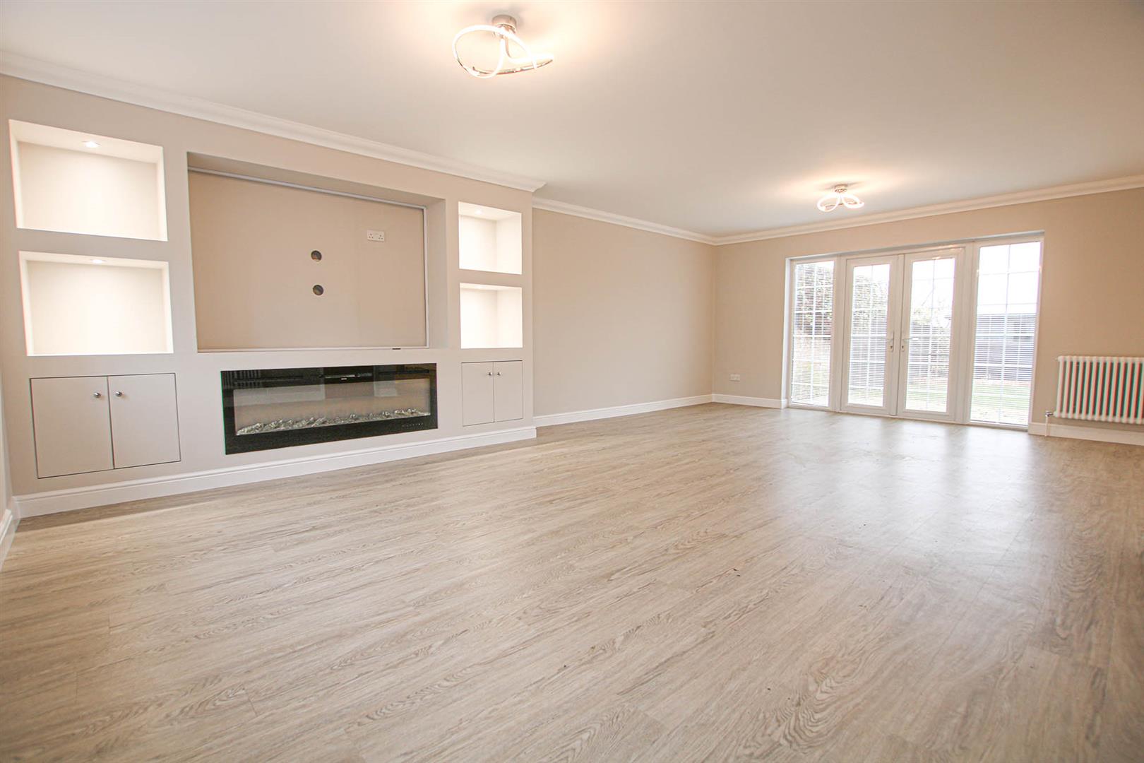 Expansive sitting/dining room with LVT wood flooring throughout. Built-in bespoke media feature with inset glass pebble fireplace, shelving and storage cupboards. Large window to the front aspect. French doors with windows either side to the rear garden. Victorian style radiators. Opening to the kitchen/breakfast room. Door to entrance hall.