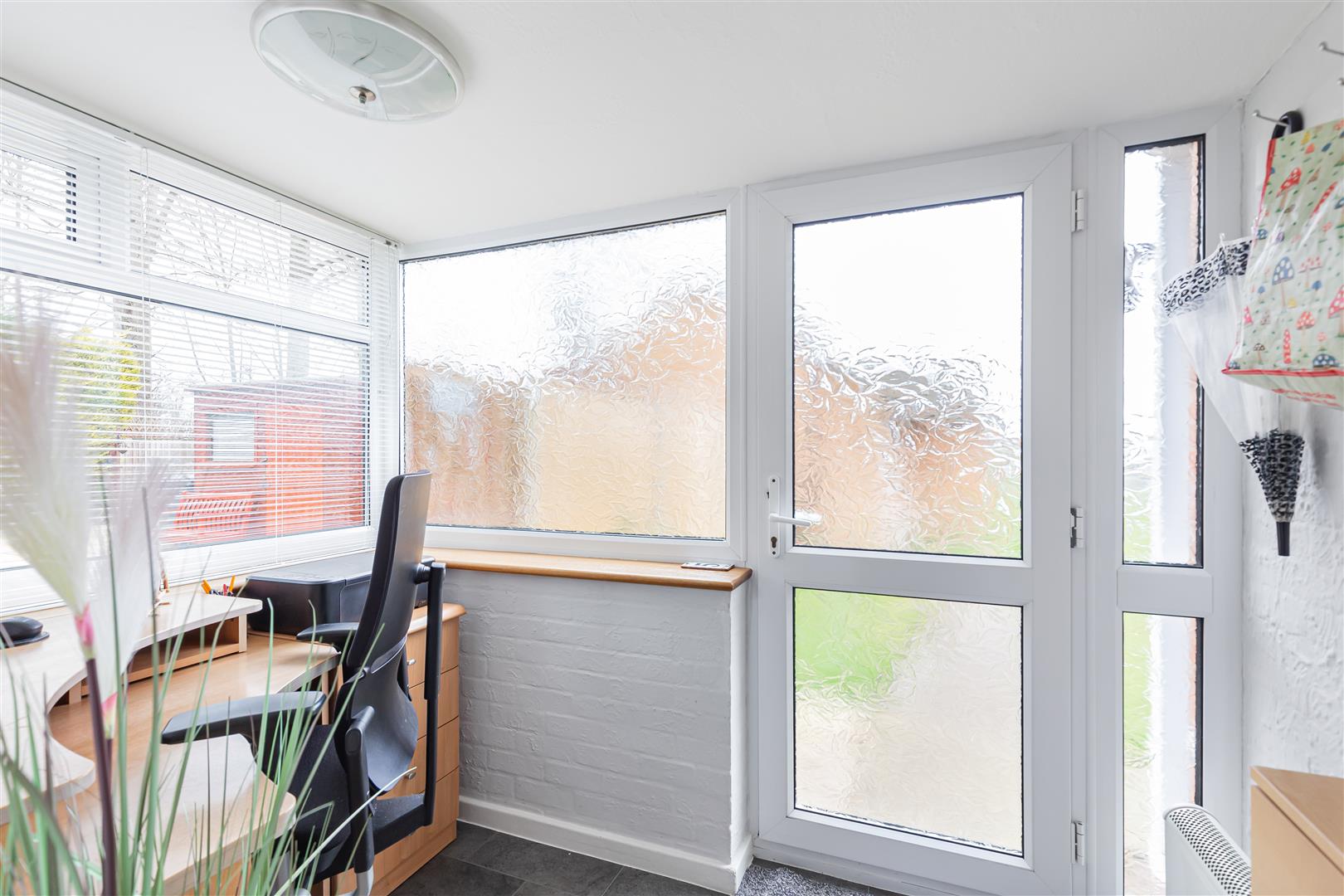 With window to the side aspect. Obscured window to the front aspect. Glazed door to the front and kitchen/dining room. Currently used as an office. Storage heater.