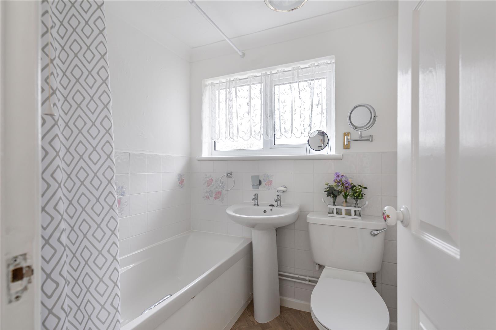 Modern white suite comprising low level W.C., pedestal hand basin and panelled bath with wall mounted shower over. LVT wood flooring. Obscured window. Door leading to the landing.