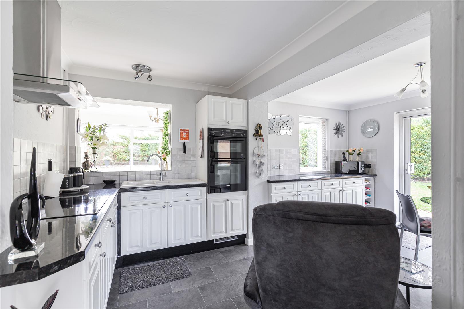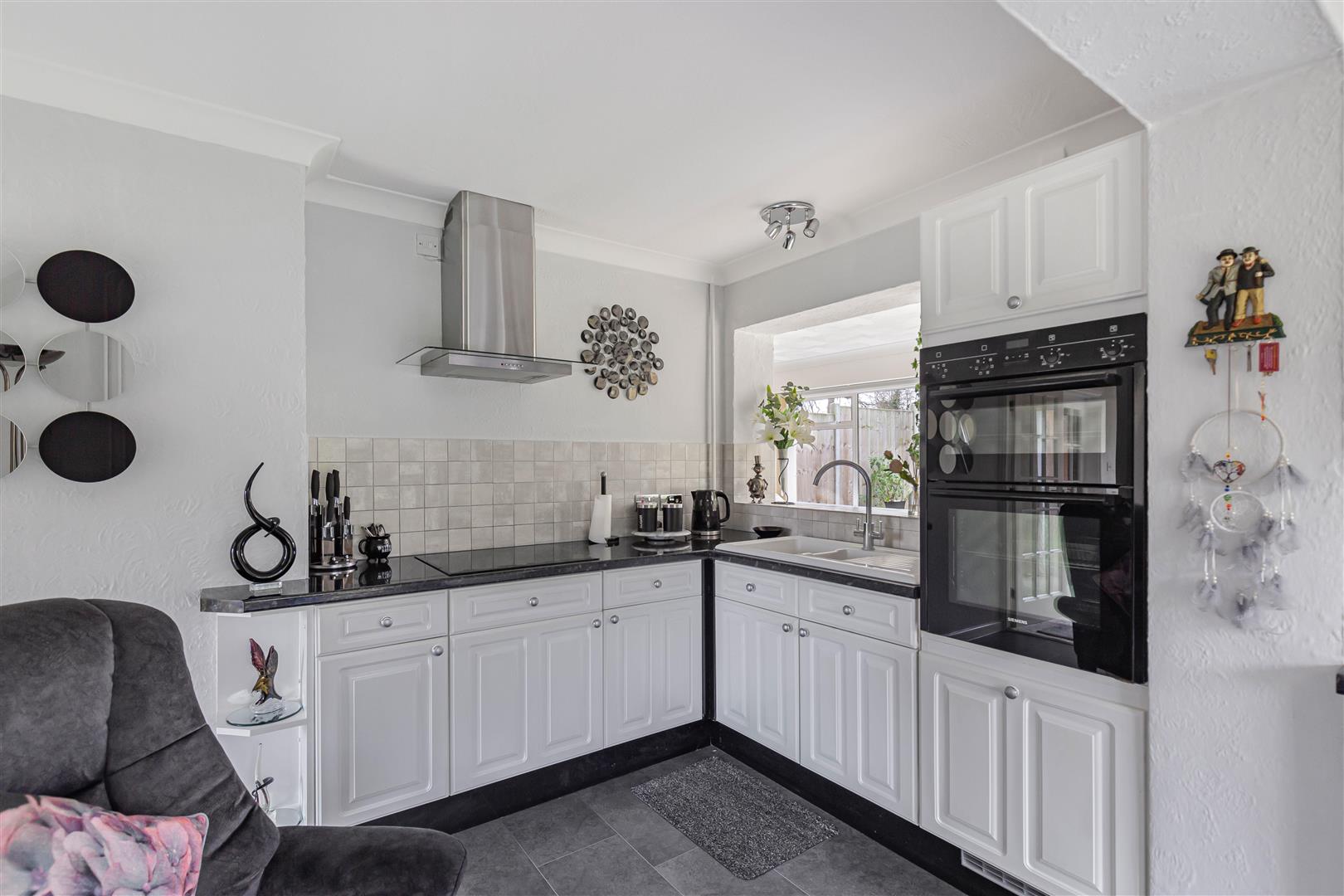 Modern kitchen with a range of base level cupboards with worktop over. Ceramic 1 and 1/3 sink and drainer with mixer tap over. Integrated eye level double oven. Inset electric hob with stainless steel extractor above. Integrated fridge. Built-in storage cupboard. Attractively tiled splashbacks. Tiled flooring. Window to the rear aspect. Sliding glazed doors leading to the rear garden. Glazed doors to the entrance hall and the front porch.