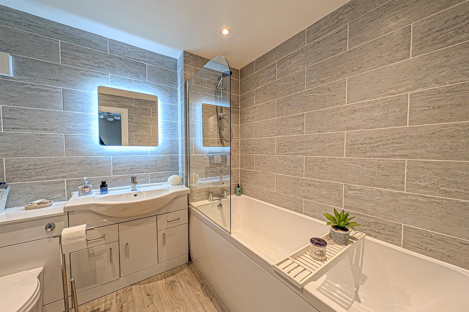 Contemporary white suite comprising low level, concealed cistern, W.C., inset handbasin with mixer tap over and built-in storage under and panelled bath with mixer tap and wall mounted shower over. Attractively tiled. LVT wood flooring. Door leading to the landing.