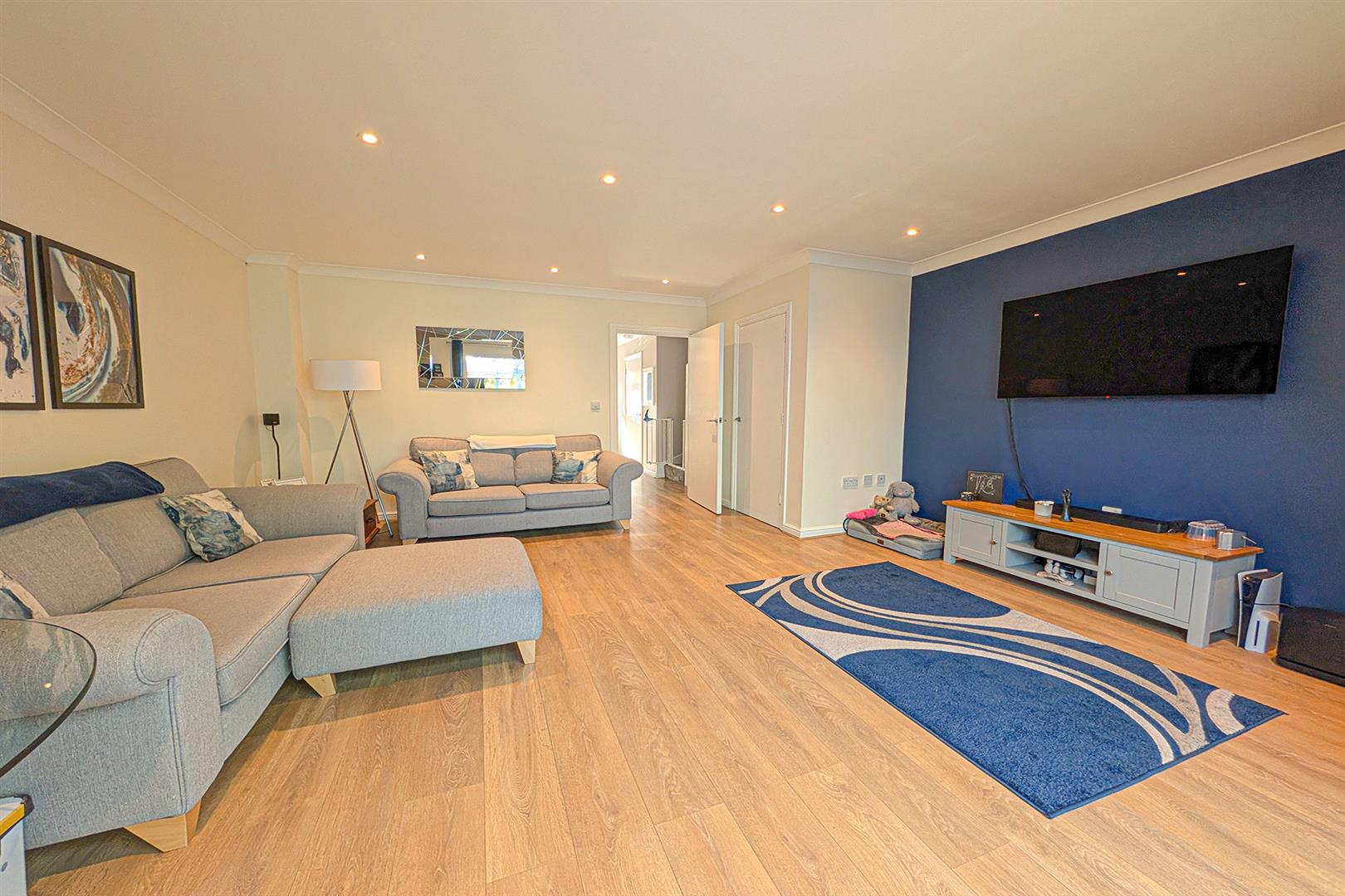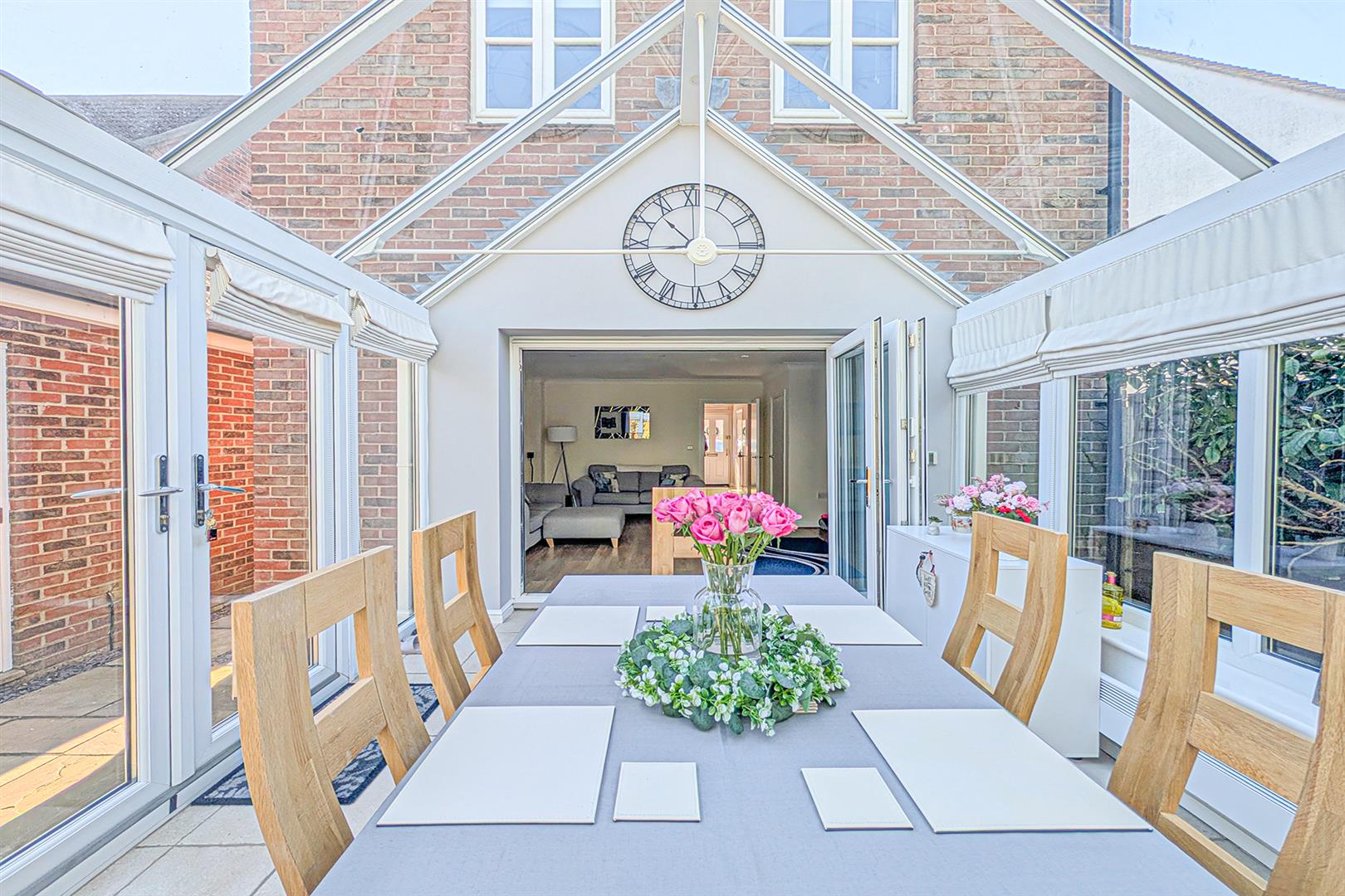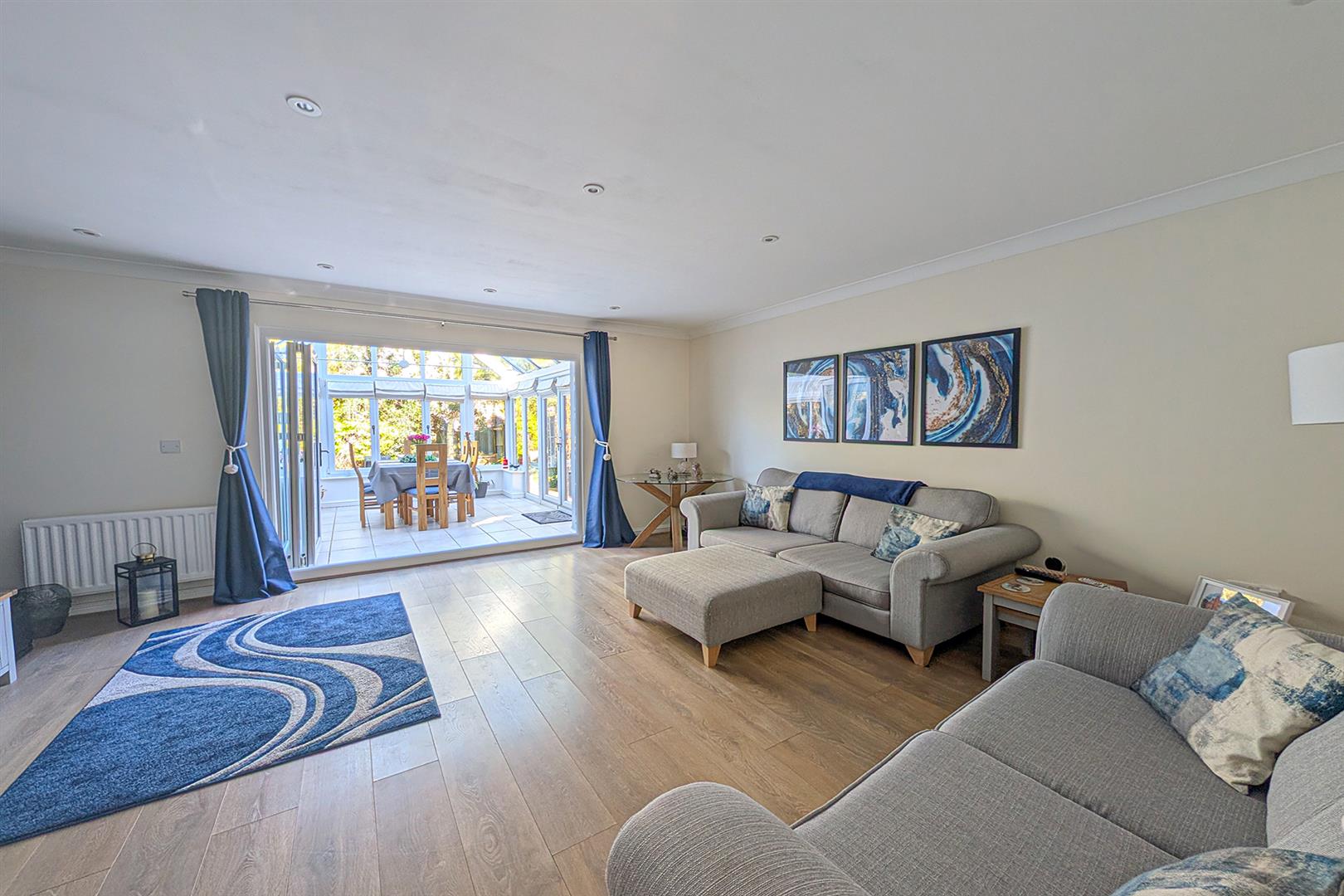 Beautifully presented, spacious living room with wooden flooring. Radiator. Door to the understairs storage cupboard. Bi-fold doors leading to the conservatory. Door leading to the entrance hall.