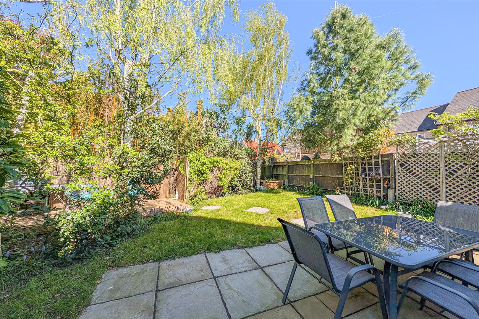 Charming rear garden with patio area to the rear of the house with French doors leading to the conservatory. Lawned area beyond with a plethora of planting to the borders. Decked seating area to the rear. Pedestrian doors leading to the gym/studio/office and double garage.