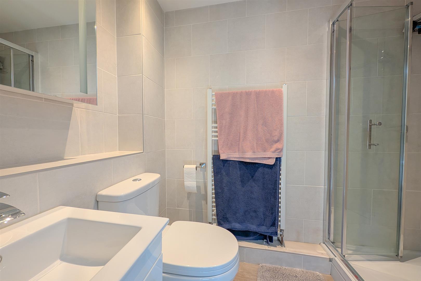 Contemporary white suite comprising of low level W.C., handbasin with mixer tap over and walk-in shower cubicle. Attractively tiled. Ladder radiator. Door to the Master bedroom.