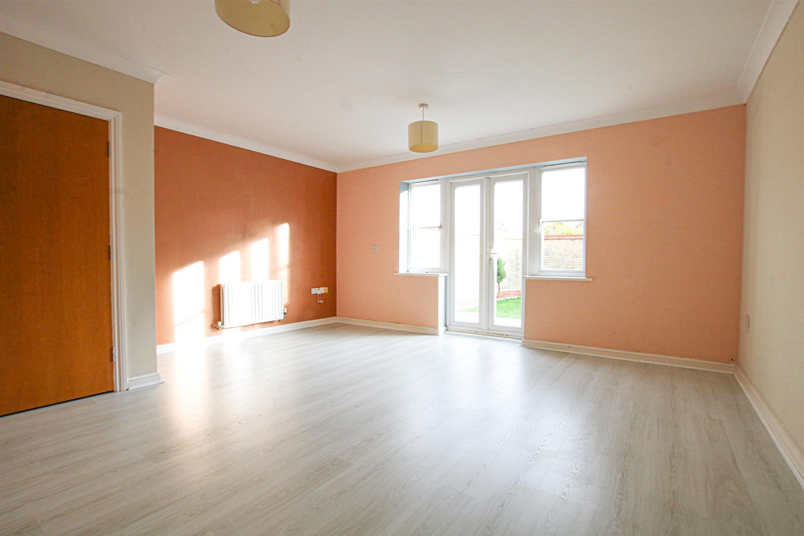 Double glazed French style doors leading to the rear aspect, double glazed windows to the side aspect, television aerial connection point, two radiators and large understairs cupboard.
