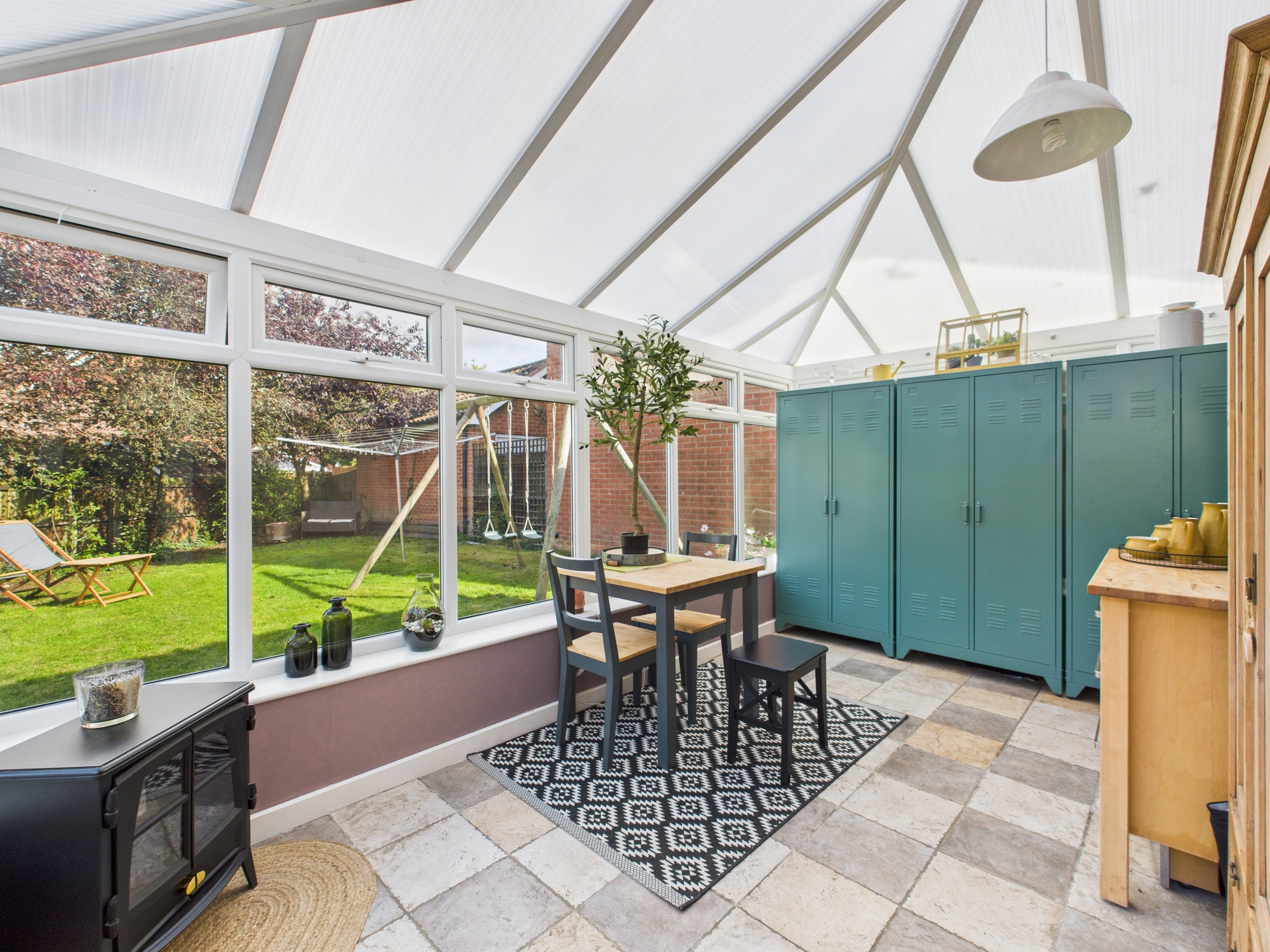 Part brick/ part uPVC double glazed construction with top opening windows, polycarbonate roof, ceramic tiled floor, double opening patio doors to rear garden.