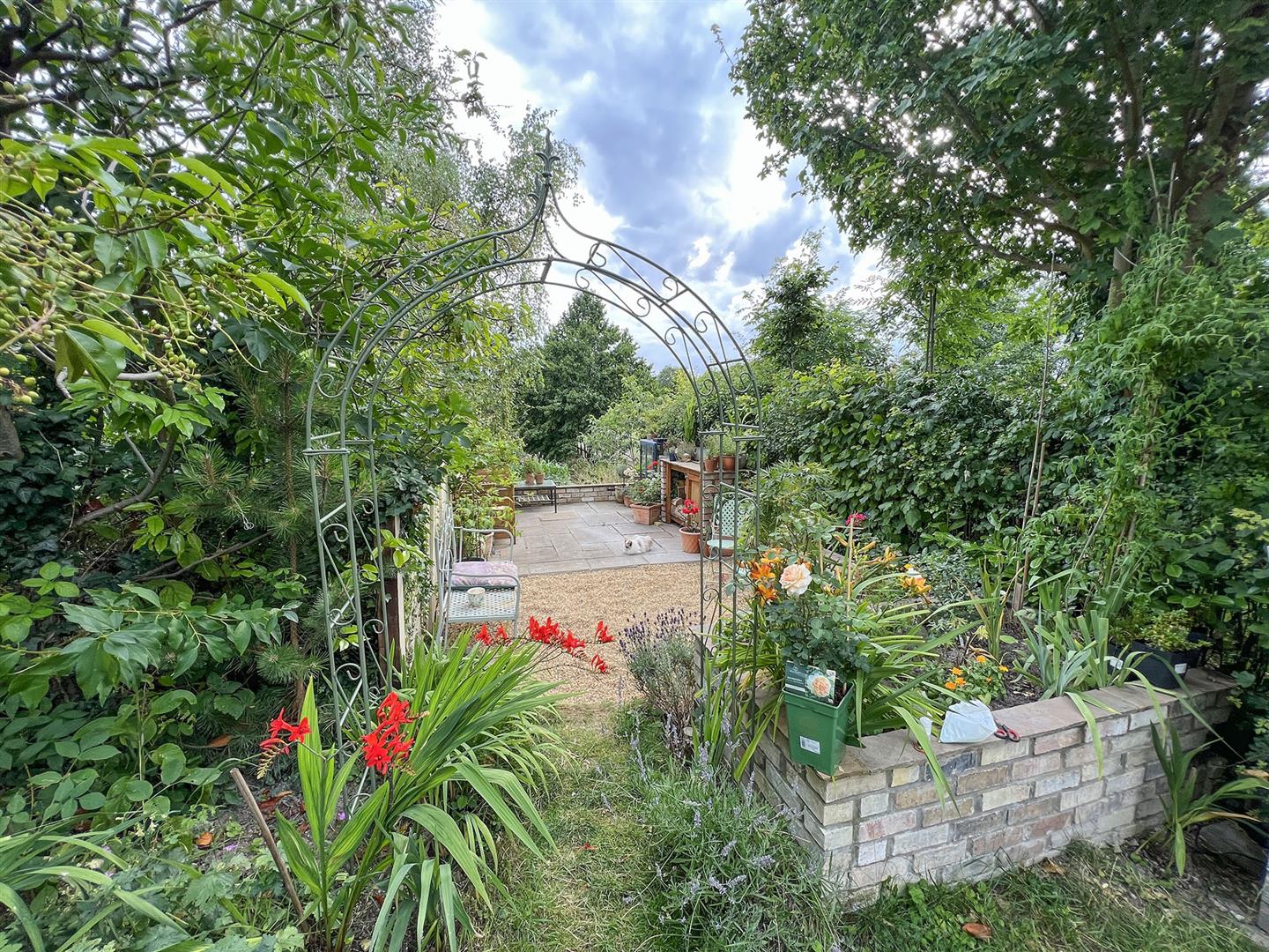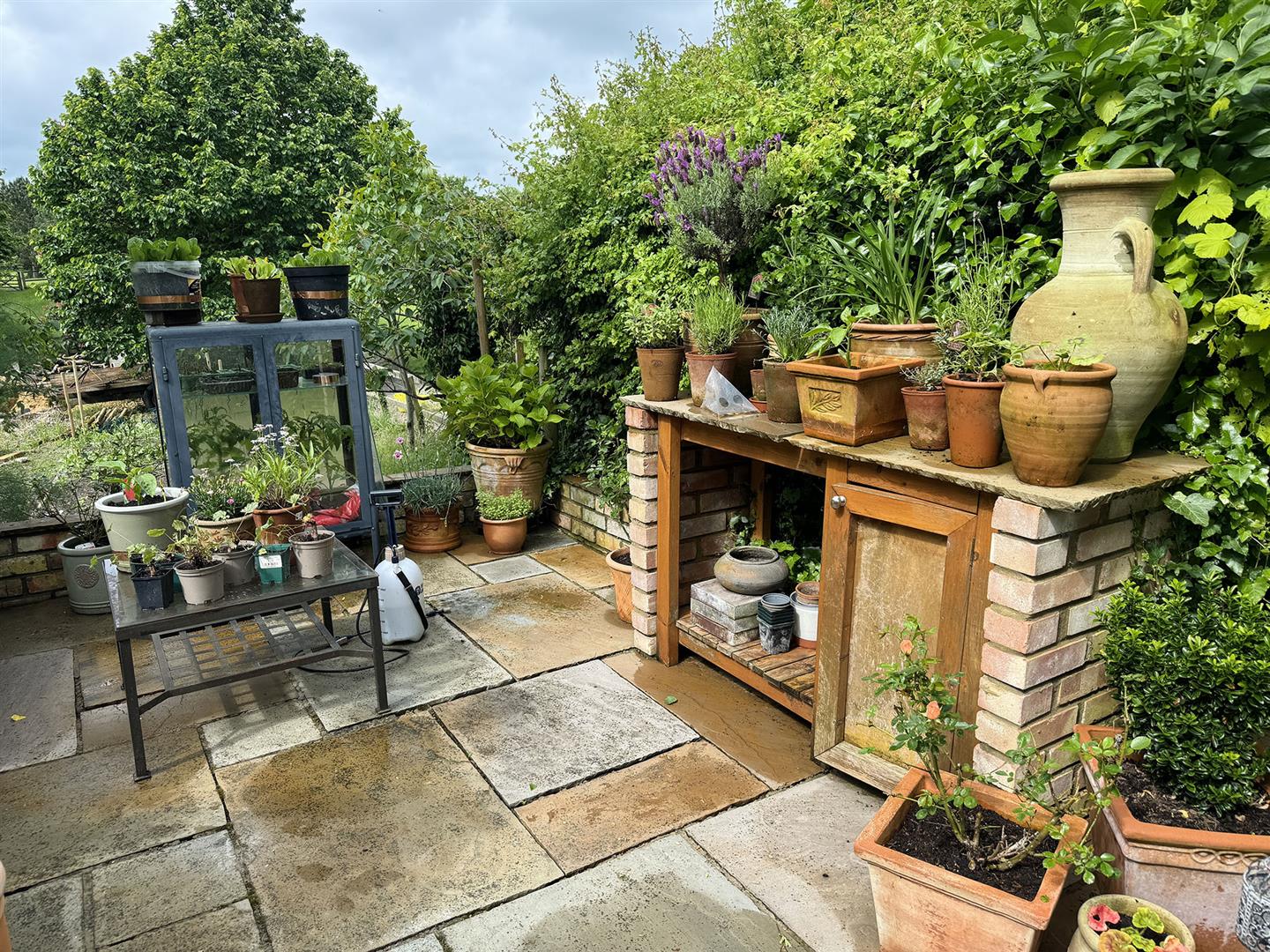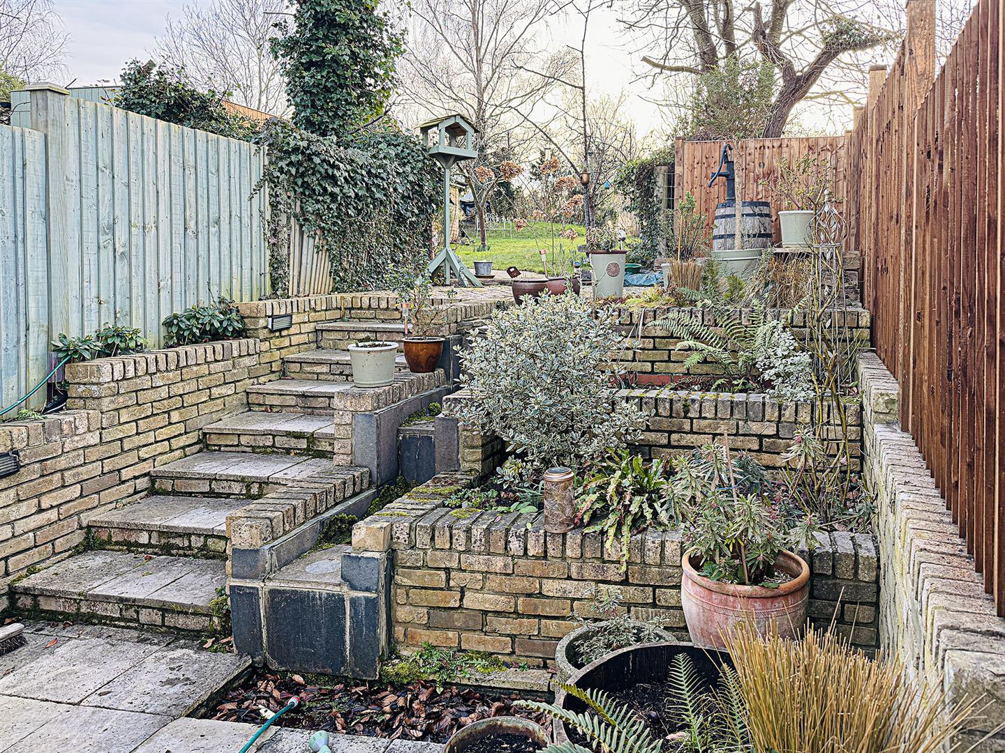 Private garden with shed, fully insulated outbuilding with double glazed window and doors, patio and decked areas, part laid to lawn with a range of raised borders, beds and fruit trees, overlooking open paddock fields.