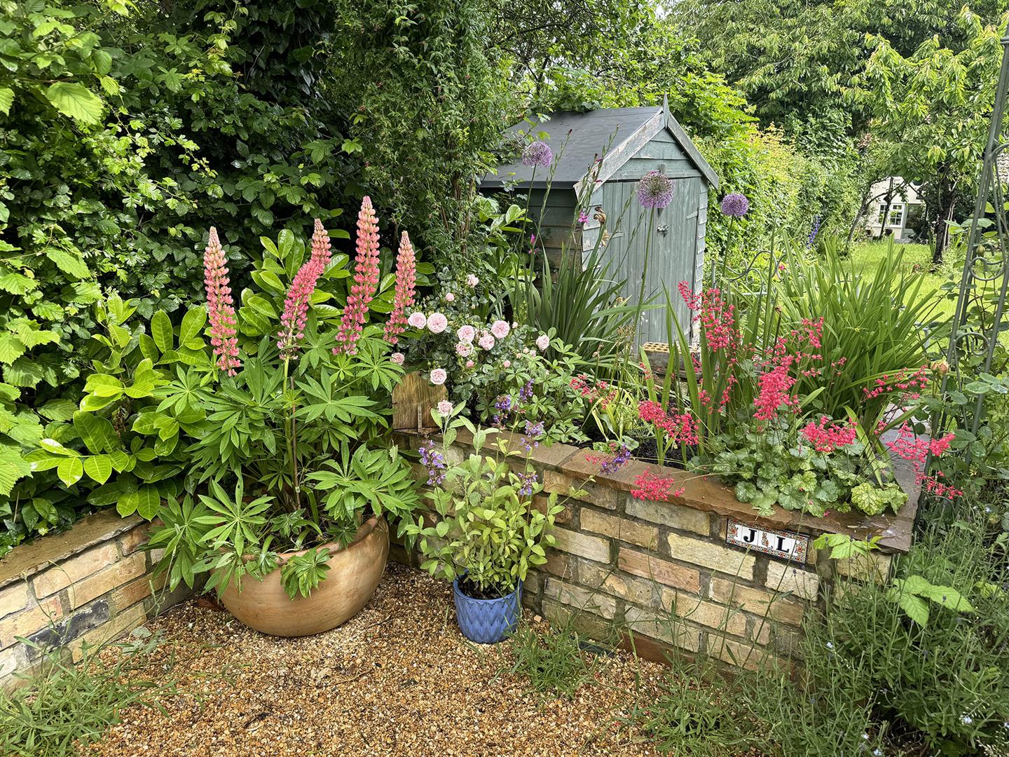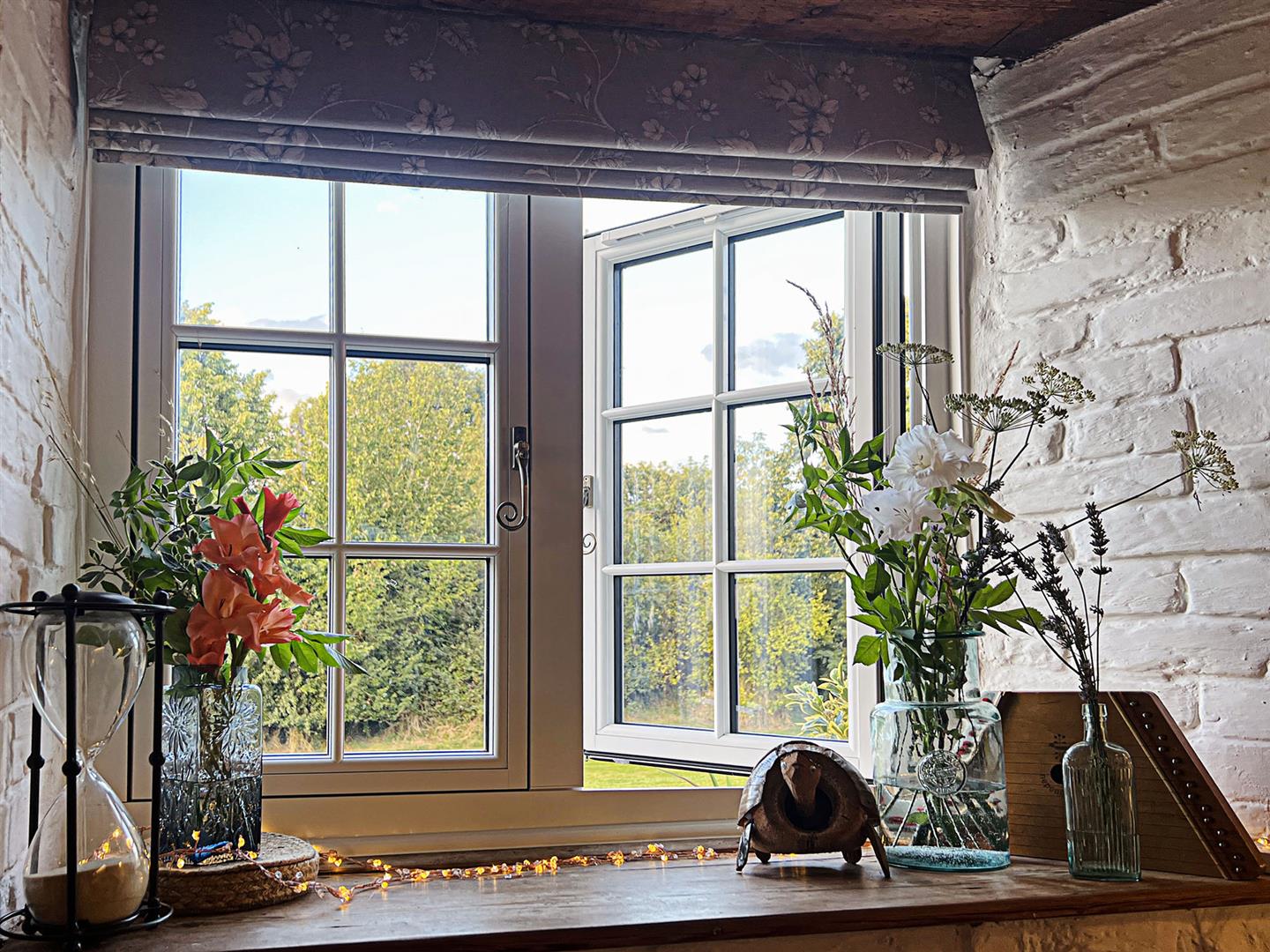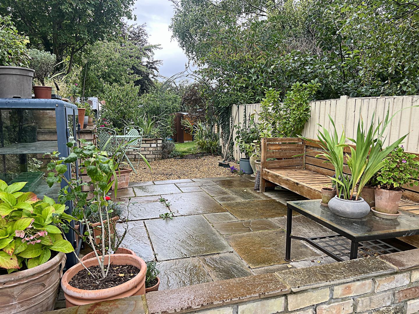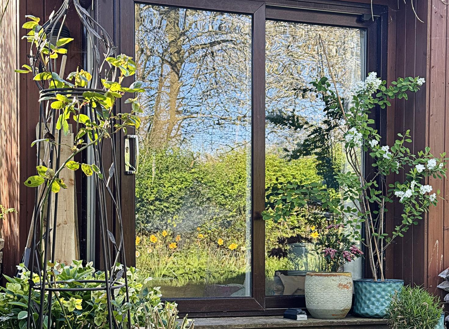 Private garden with shed, fully insulated outbuilding with double glazed window and doors, patio and decked areas, part laid to lawn with a range of raised borders, beds and fruit trees, overlooking open paddock fields.