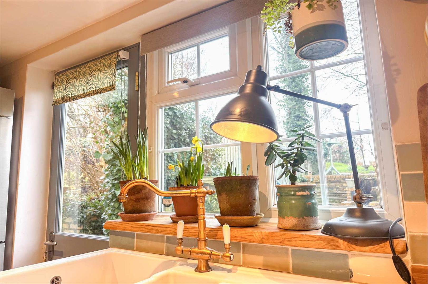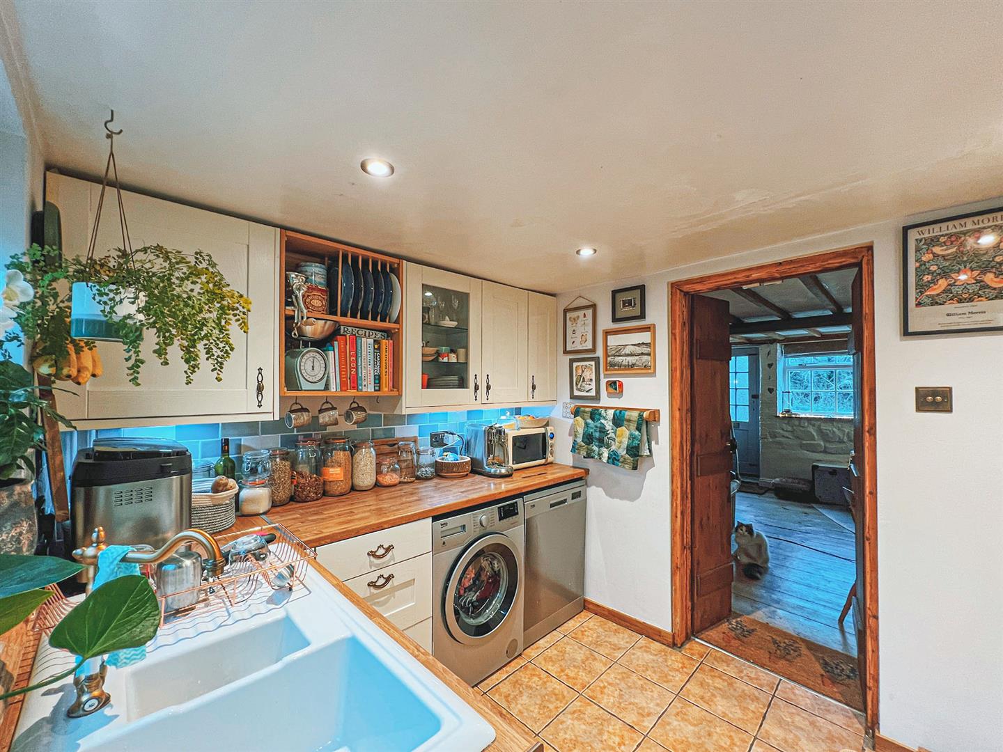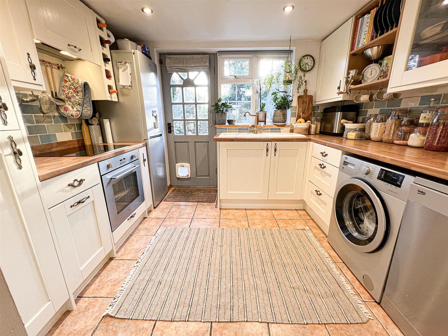 Fitted with a range of eye level and base units with worktops over, inset one and a half bowl sink unit with drainer and ornate mixer tap, part tiled walls, built in oven, induction hob with extractor hood over, space and plumbing for washing machine and dishwasher, space for fridge freezer, tiled flooring, window to the rear aspect, door leading to garden.