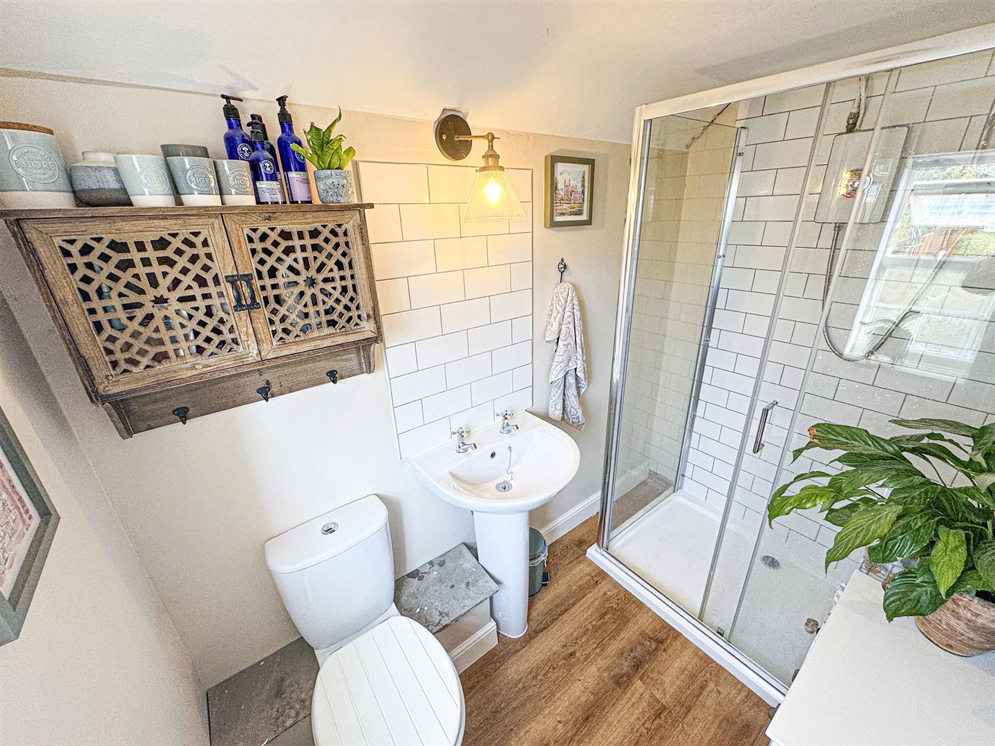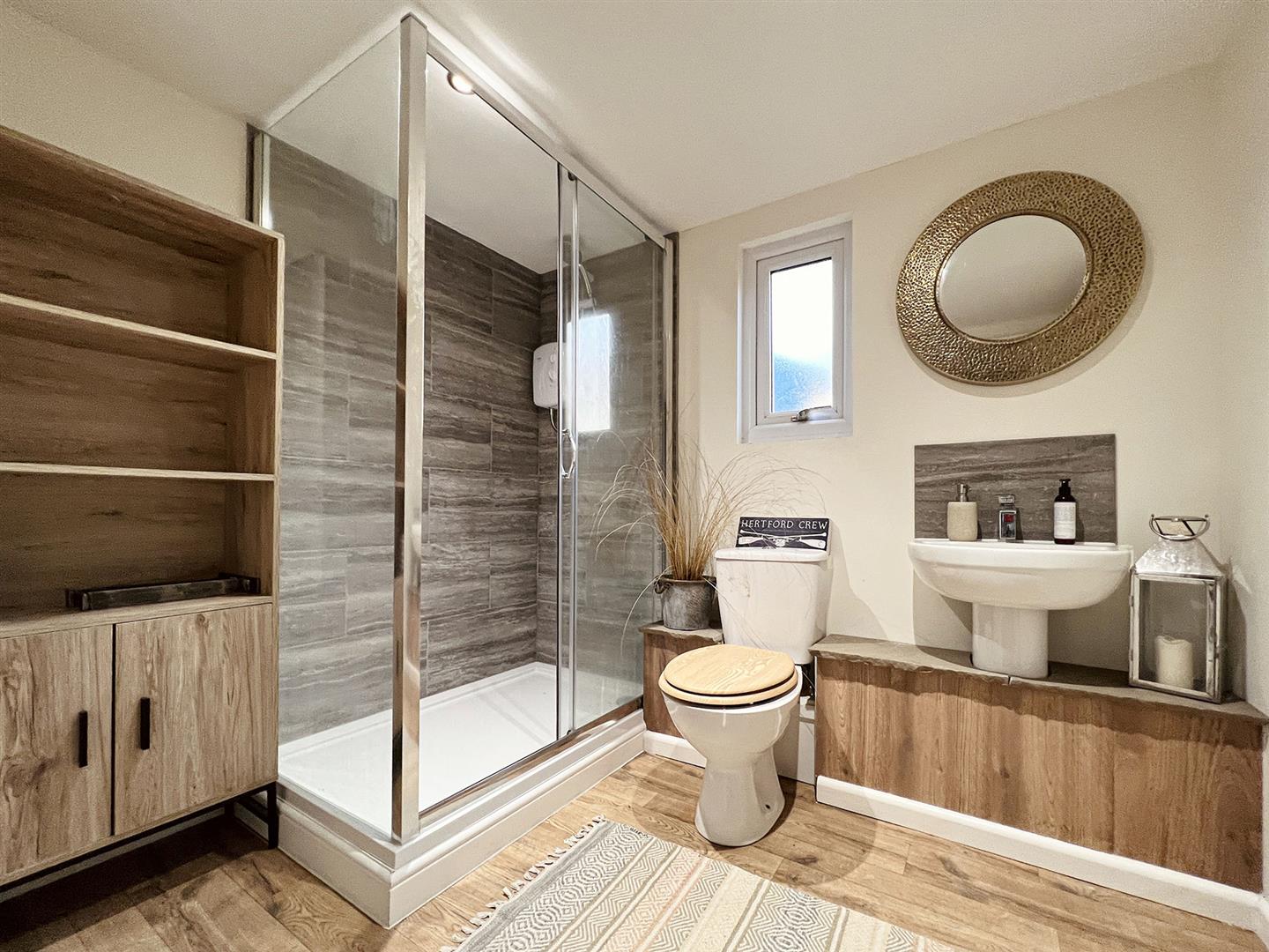 Suite comprising low level WC, pedestal hand wash basin, shower cubicle, radiator, part tiled walls, wood flooring, obscured window to the rear aspect.