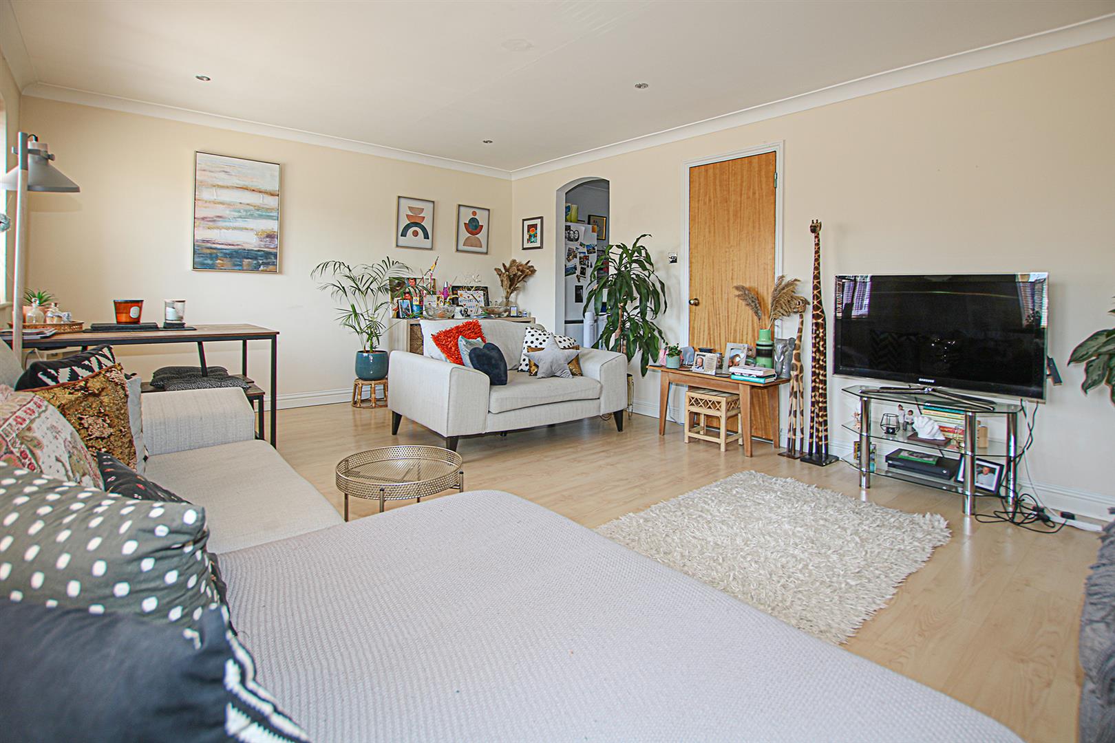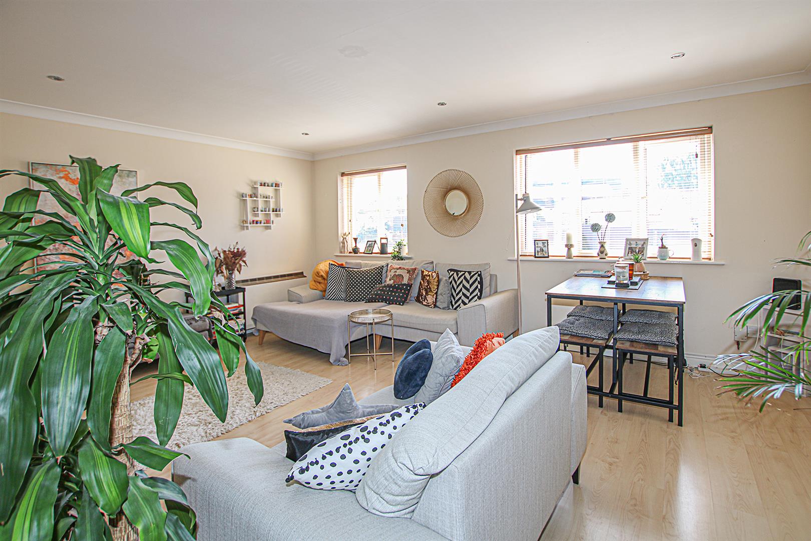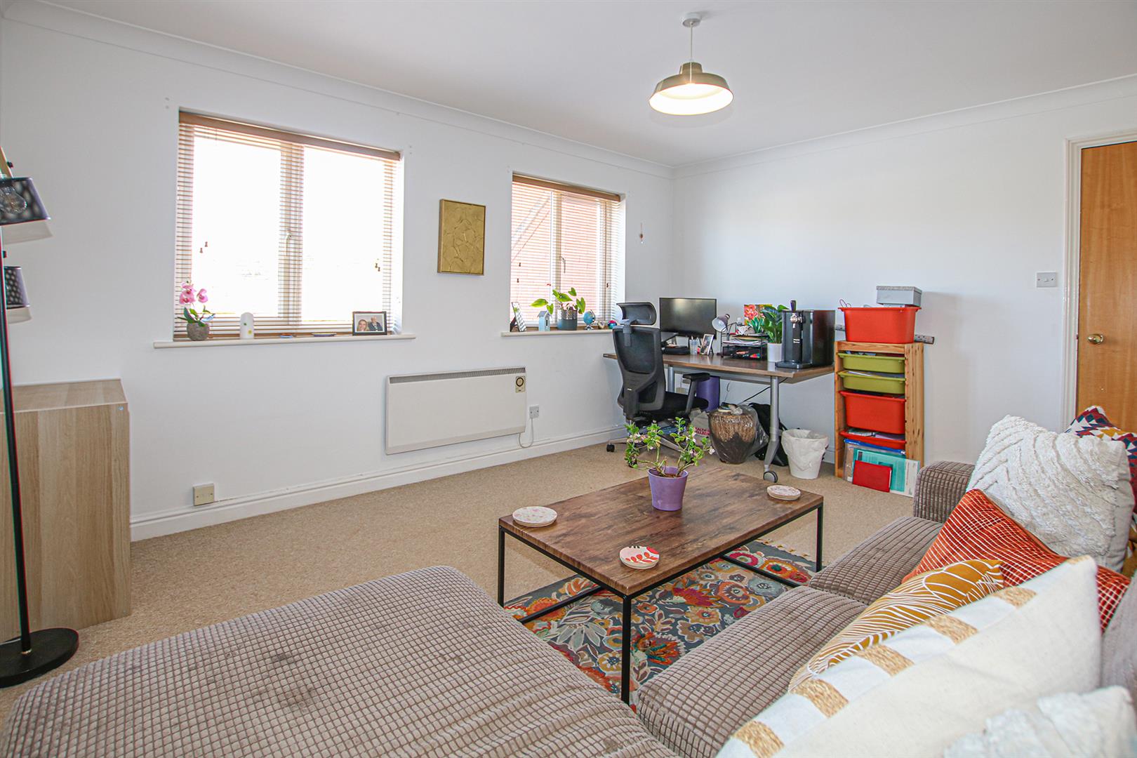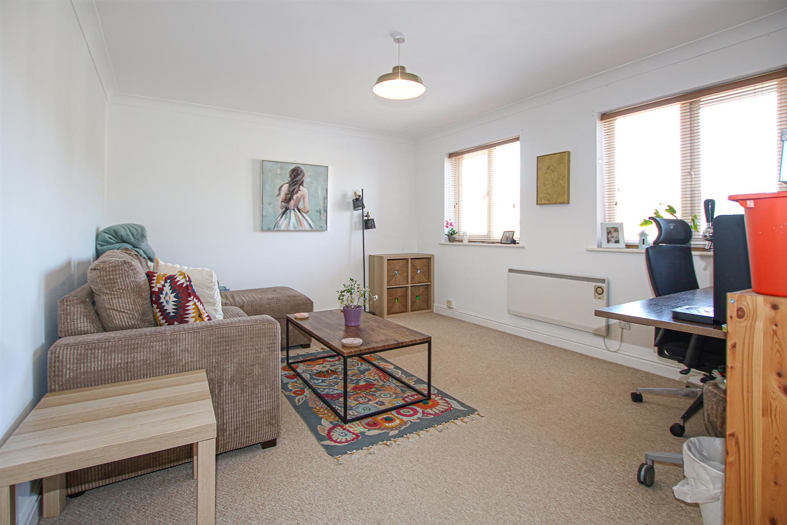 Spacious living room with dual aspect windows. Opening to kitchen. Door to entrance hall. Electric storage heater.