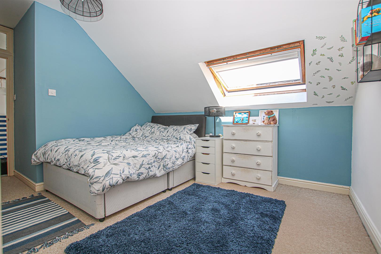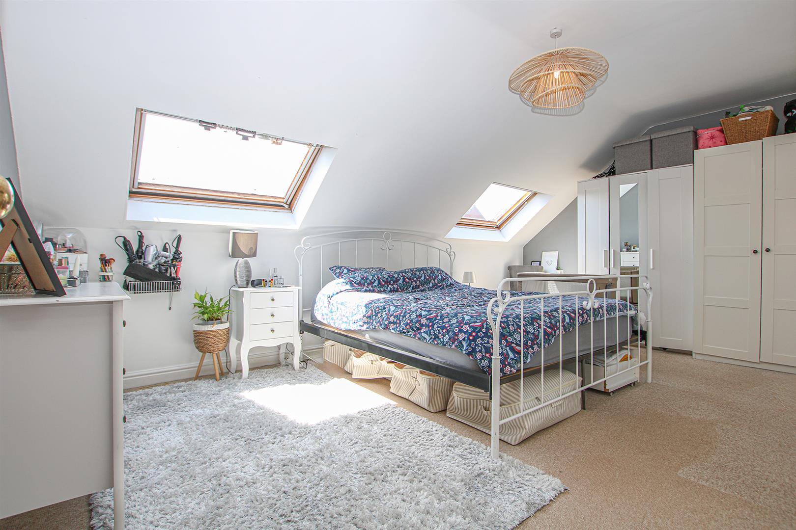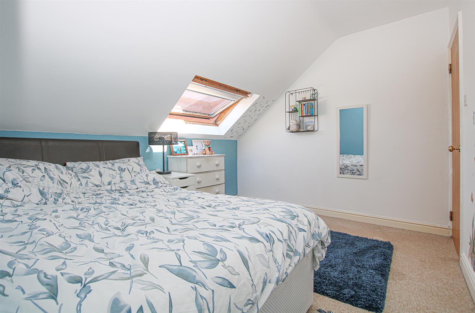 Generous double bedroom with 2 skylights, door leading to: