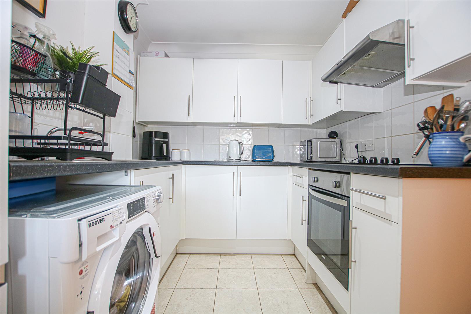 Fitted with a range of wall and base units with work tops over, stainless steel sink with mixer tap over, integrated oven and hob with extractor over, space and plumbing for washing machine.