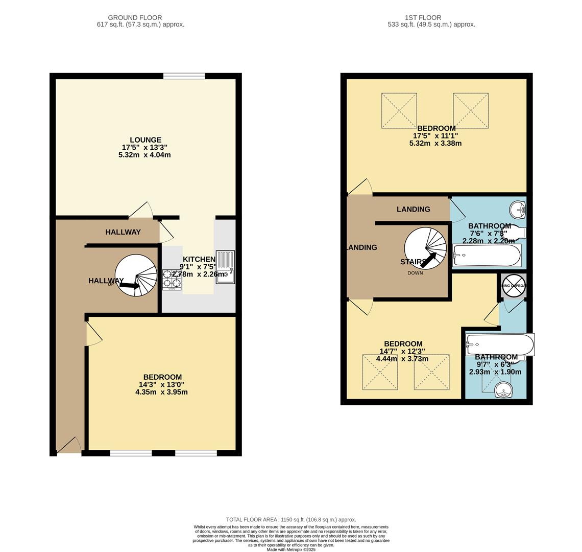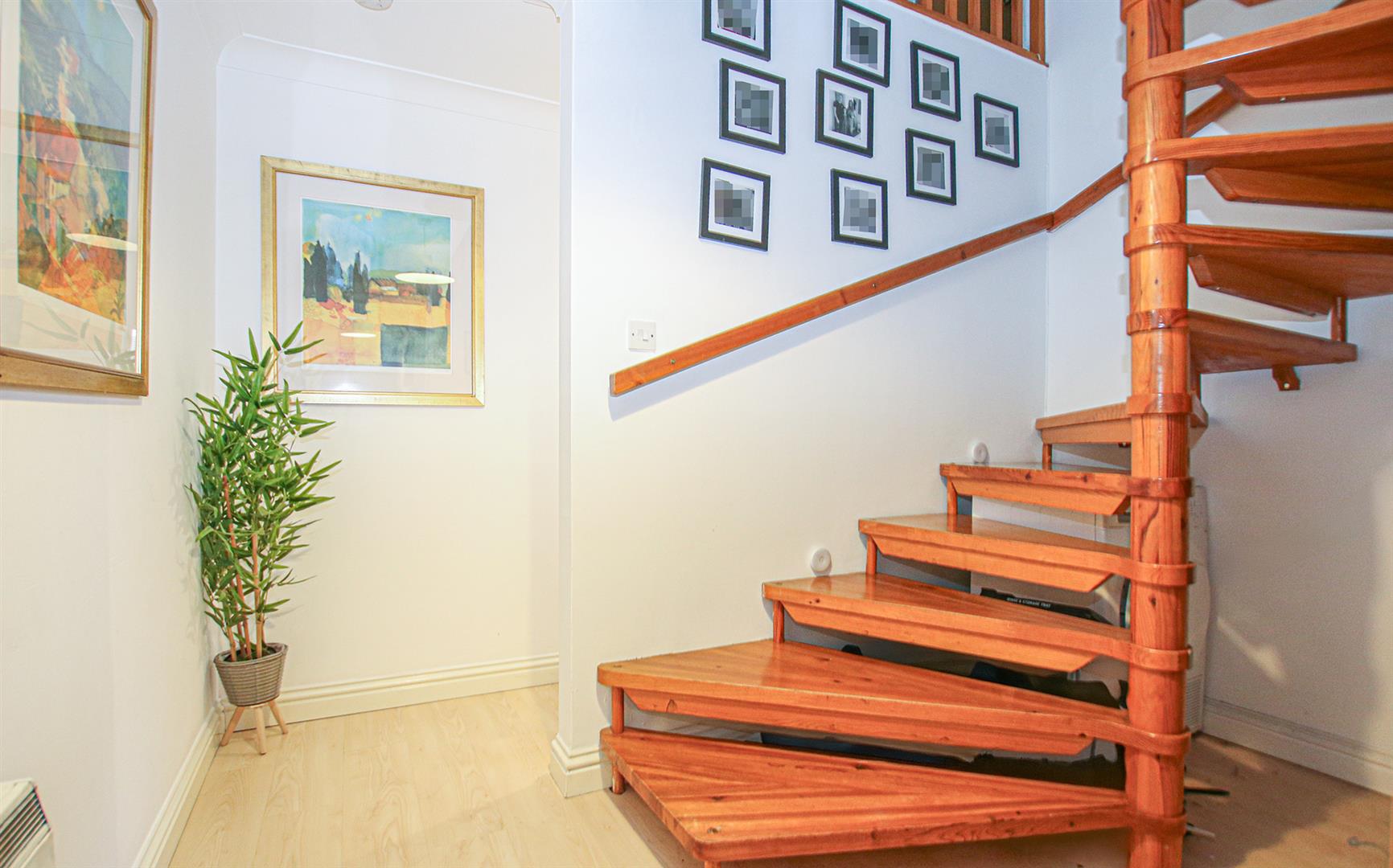 With doors leading to kitchen, lounge and bedroom. Electric storage heater. Spiral stairs leading to first floor.